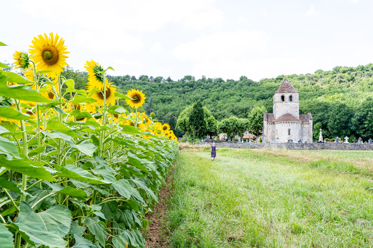 In a patchwork of fields shiny green stalks of corn sit alongside a duller, moss-green, wide-leaved plant I couldn’t identify and would never have guessed until told, unaware that tobacco was ever grown in France, never thinking that it still would be – smoking is more common here than in New Zealand. Bright yellow glows from a distance, like the rapeseed in England, but here it is altogether more beautiful close up – golden sunflowers, their large heads dipping in the breeze, turning with the sun (earning them their French name: tournesol), a church alongside completing the postcard view. With thick lines of mature trees as a border, the whole thing looks like a quilt thrown over the undulating land.