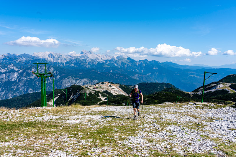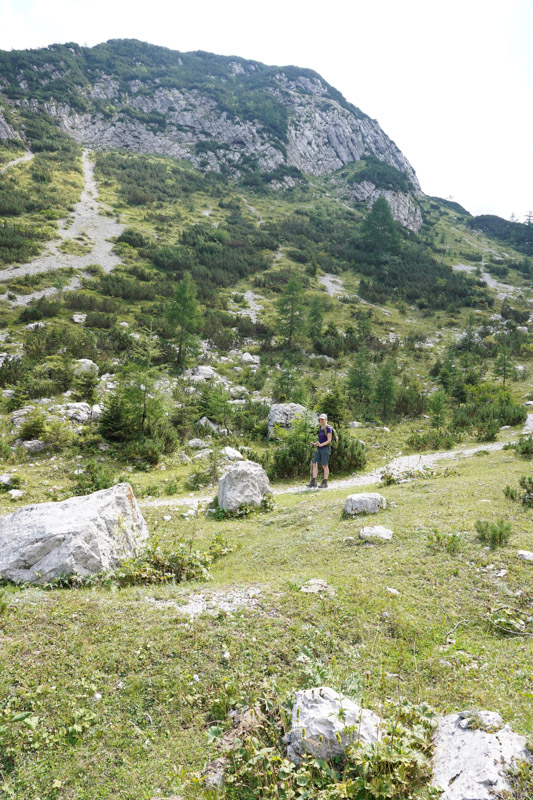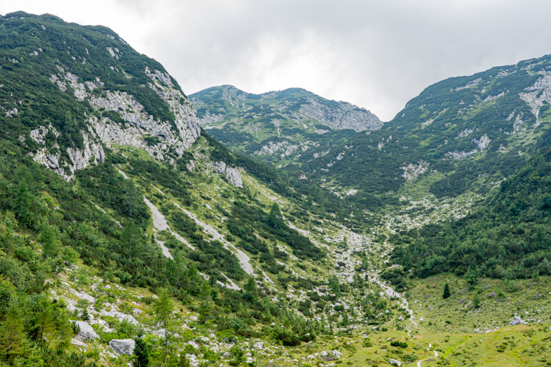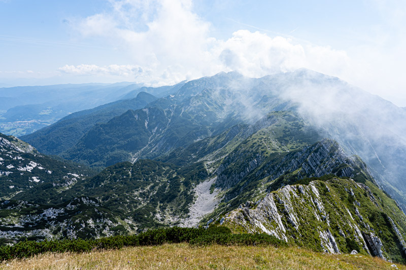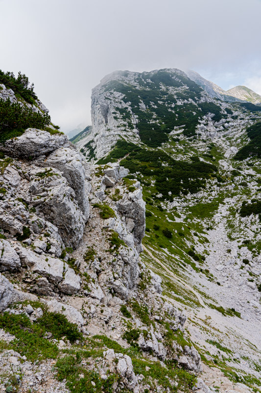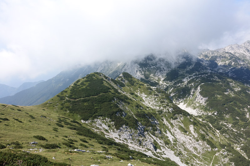 We fasten our boots and head away from the crowds as two blokes leave the bar with beers. Proof of what we had read – that Slovenians drink beer at any time! We walk uphill on grassy slopes scattered with scree, the stone so white it’s blinding. Despite how high we are the surrounding dark craggy peaks, flicking in and out of thin cloud, seem so tall, circling lower domes on which scrubby green vegetation clings. The paths are well marked and easy to follow, and whichever way I turn there are stunning views and steep drops.