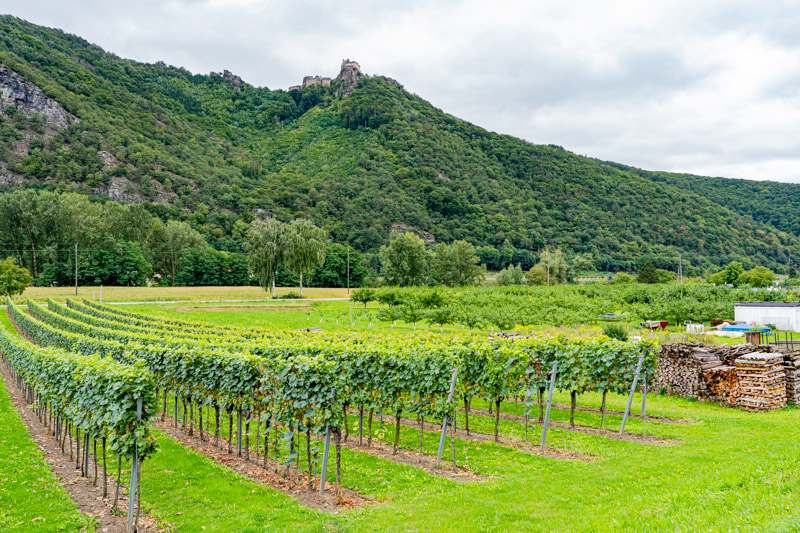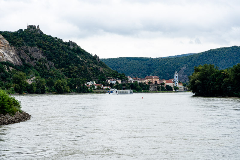 This area is very scenic, castles lurking on clifftops, one described as a ‘romantic ruin’ that is a ‘lovely side trip.’ Romantic or not, unless it comes with a hoist up the hillside it’s not going to happen. It’s hard enough cycling up the short, steep slope into Durmstein, an incredibly picturesque village in the middle of wine country. It’s packed, impossible to cycle through, the main street lined with shops and cafes stuffed with tourists looking rather less dishevelled than we do. We pause to remove raincoats and watch, impressed, as one of the huge barge-boats does a handbrake turn in the river alongside. It’s clearly a practised manoeuvre, the stern swinging around rapidly in the current as the bow stays more or less fixed in one place. It’s also clearly a turnaround spot, two more doing the same as we cycle away between the vines.