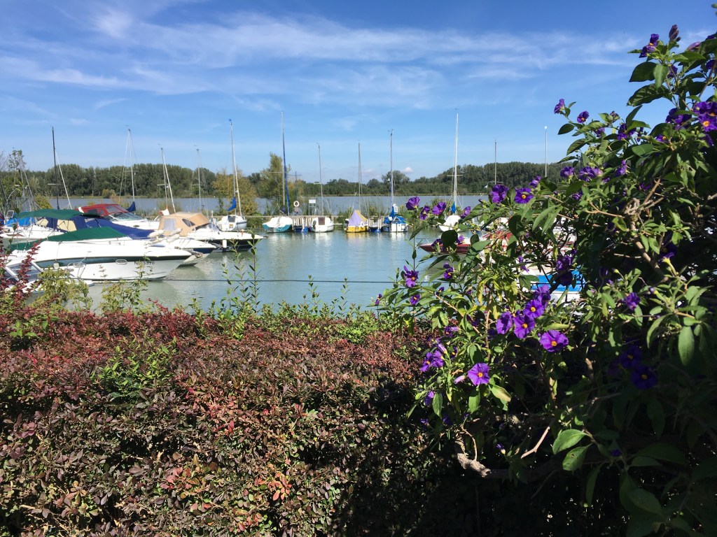 The wind is against us again. How does it happen that the grass whispers of a breeze and a rustle in the trees talks of a light wind, but my body feels like it’s pushing into a Wellington northerly? It’s hard going for my tired legs and, not for the first time, I envy those whizzing past on e-bikes. Thankfully the sun is shining. We stop by a small marina for coffee, pink flowers framing a view of the river. Despite the blue of the sky the river still isn’t, struggling to attain a hint of turquoise where the water lies undisturbed, otherwise grey and colourless. Whoever was behind The Blue Danube was a marketing genius ahead of his time.