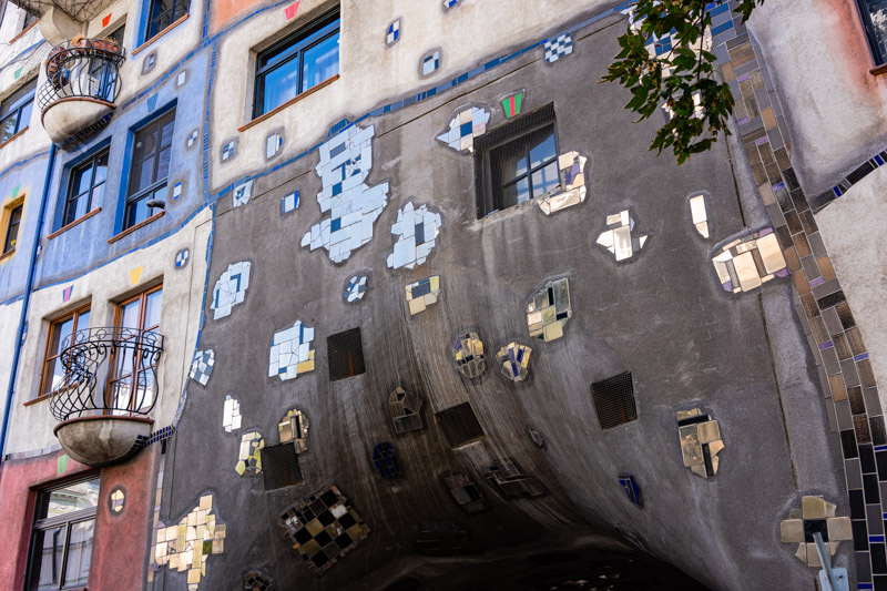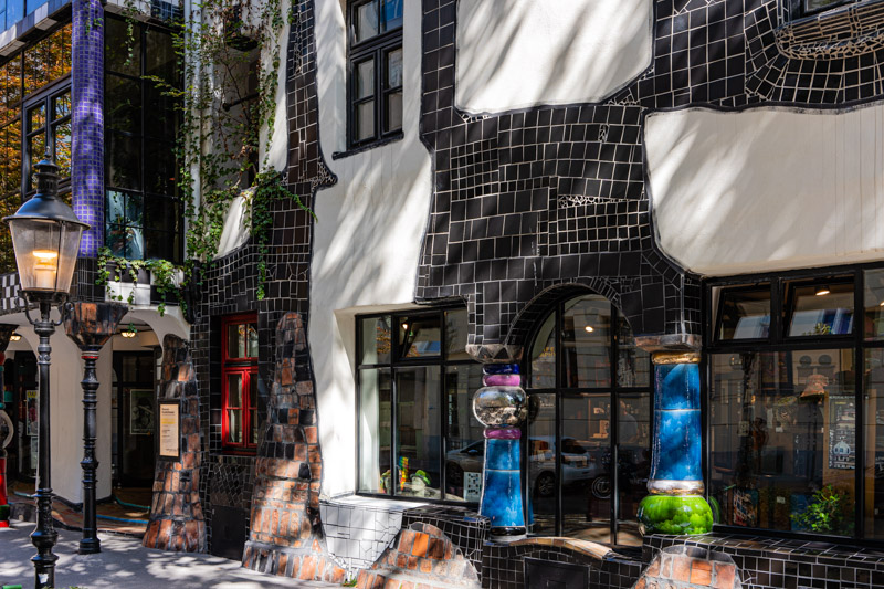 We’ve had enough of crowds and grand buildings and head in search of a different type of architecture, having discovered that Vienna is the birthplace of Friedensreich Hundertwasser. (He’s well known in New Zealand, having designed the public toilets in Kawakawa as a repayment for the kindness shown to him by local people when he was ill whilst visiting the town.) It’s not difficult to find a Hundertwasser building in a city street; his signature bulbous, colourful columns and haphazard tiles are easy to identify in a sea of plain brick and glass – he described the straight line as Godless and immoral. The Kunst Haus is an engineering marvel, not a straight line in sight, rolling floors and sloping pillars, asymmetrical and amazing. He was a prolific artist and we spend a very enjoyable couple of hours wandering through the permanent exhibition of some of his paintings and models of buildings he designed, some built, some merely ideas that never came to fruition. I wish more had and that I had the chance to live in one.