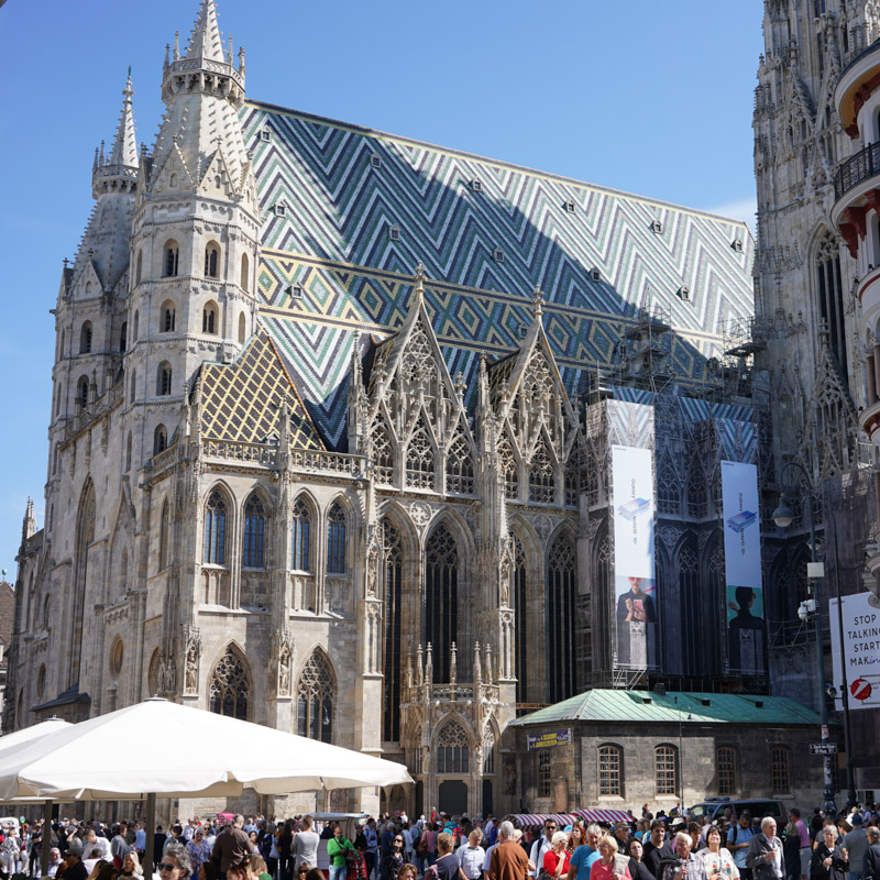 There is clearly a deal on scaffolding in Austria at the moment, many places framed by the stuff and shrouded in plastic, including the huge cathedral in Stephansdom that towers over us as we exit the U-bahn. We have a quick peek inside but it rivals Maria Taferl in the gilt stakes and there’s a mass about to start so I scuttle outside quickly. I always have a feeling of imposter syndrome when I’m in a religious place, as if I’m an intruder. I’m careful not to offend others’ religious beliefs and if I stay around whilst a holy service takes place I may as well have a flashing neon sign over my head.