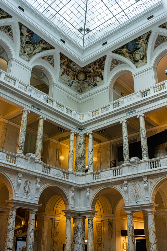 We enter the Weltmuseum in search of toilets and a kind lady lets us use them even though the museum is closed today. We pass through an interior atrium four stories high, light filled and neck-achingly impressive. Marble pillars stretch its height, archways on each level leading to corridors that presumably lead to glorious rooms.