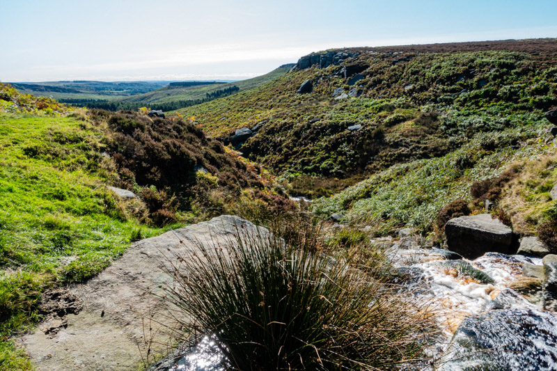 We reach Fox House in half an hour, too early for a beer so settle for coffee. The return path, past Padley stream (which as I child I thought was so called because we paddled there) is wet, the ground sodden. Paths have become waterways and the river runs fast with mud. In contrast, the streams off Carl Wark are clear, the water running over grass, not stained by peat as it normally is. We find a sheltered spot in the rocks to eat lunch, looking over wild and wet ground towards Longshaw. I’m reluctant to leave.