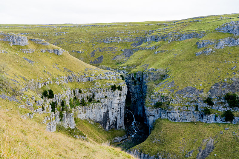 We break out above the gorge and cross farmland, the view opening up towards Ingleborough in the distance, looking smaller than it is, easier to conquer than the tough reality. From here the gorges are almost hidden, a few treetops barely visible to show they exist. We drop into the second one, the water falling beside us, a steep cliff opposite. A gaggle of school children march past, a few haring off down the treacherous path, the teacher asking them not to break a leg as ‘the paperwork would be horrendous.’