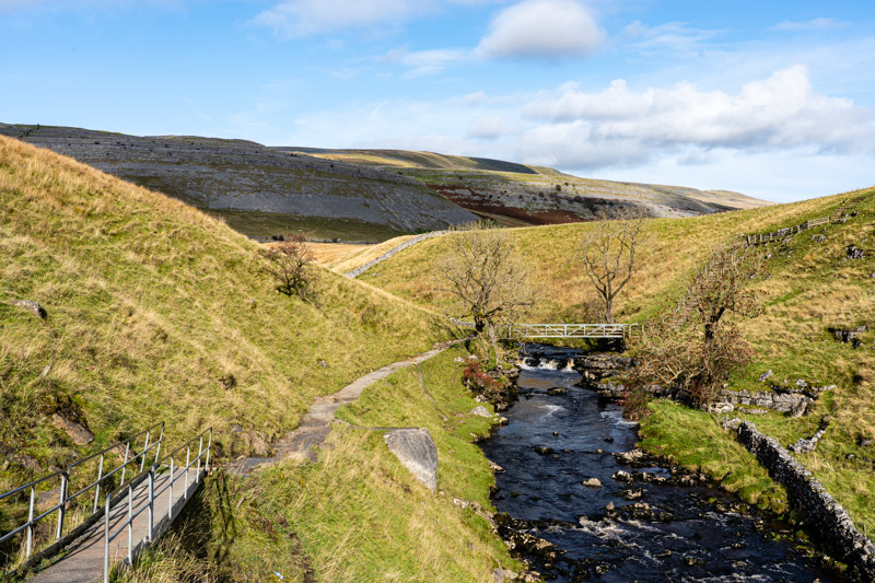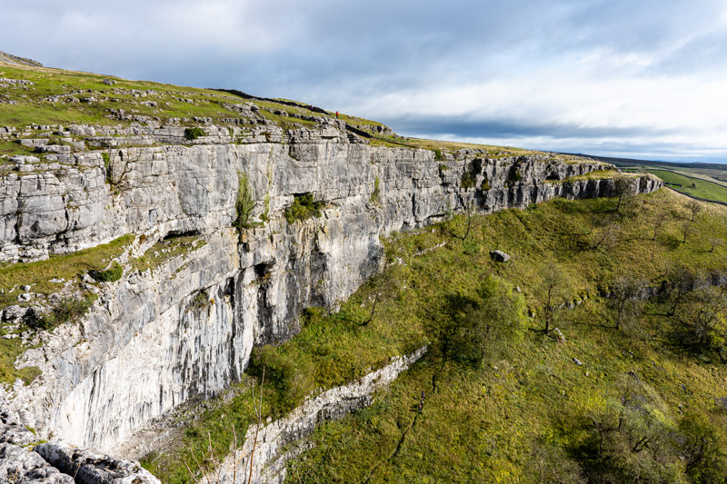 There’s a lot of limestone around here and it makes for some amazing sights, including those around Malham. We walk via Janet’s Foss, named for Jennet, the Queen of the Faeries, Foss being a Scandanavian word for waterfall. I can see why fairies might live here, twin spouts of water falling into a sheltered pool, but we’re a bit waterfalled out and it doesn’t compare to any of those around Ingleton. The path leads us into Gordale Scar where the valley narrows, within 100m, to a steep-sided cleft in the rock, spectacular and skyscraper tall – and a little bit scary. It looms over me as I look up and, despite that it’s been here a while, created in the last ice age, looks threatening. I picture myself buried under tons of rock and scurry out whilst Neil lingers with his camera.
