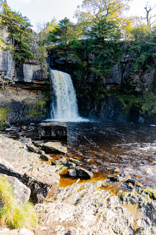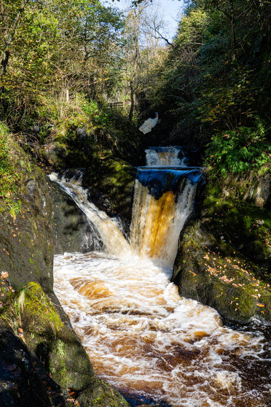 The path is wet and muddy, stones slippery with a coating of soggy leaves and soggier earth. The sound of rushing water is constant as we walk close to the river, climbing up beside it in steps. The first falls are announced by a deep booming that bounces off the narrow canyon walls. The water is amber-yellow as it hurls itself over the precipice, dark and deep in the pool beneath, the colour of strong Yorkshire tea in the shallows – stains attesting to its source high on the peat moors.