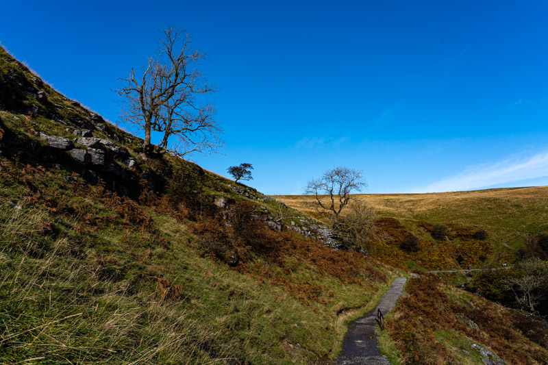 We begin to climb as the rain begins to fall, the latest in a series of short showers that has accompanied our recent walks. Cresting the ridge over Malham Cove the wind hits us with a sudden force that could knock the unwary over. We bend into it, soon drying out, heading for Malham Tarn. The water shines deep blue, edged with the golden-orange and browns of autumn trees. As we turn past it clouds darken the surface and the wind whips small waves into the far shore. We descend on part of the Pennine Way into a small valley, the going tiring and precarious over uneven ground lined with rocks rimed with mud as slippery as solid ice.