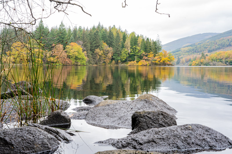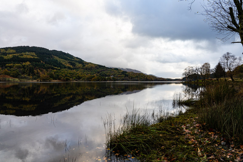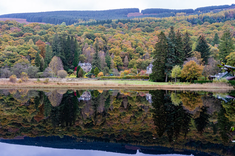 I’m a big sky girl and Scotland is a big sky country. So I’m a little disappointed when the clouds close in and truncate the view, flatten the tops of hills, hide beauty that I know is there. We turn to the Queen Elizabeth forest (clearly not Scottish Nationalist territory) surrounding Aberfoyle, walking alongside Loch Ard and a stunning, perfect reflection of the low hills beyond it which show that anything a New England fall can do they’ll have a damn good try at matching.