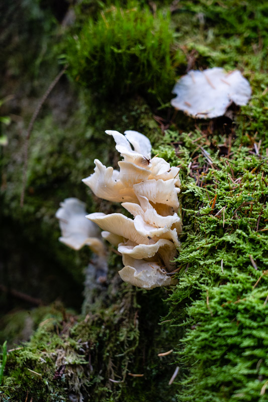 Large houses sit beside the lake, most with a boathouse at the water’s edge, and tall pines rise straight and tall alongside the path. The ground beneath them is bright green with moss, dark humps of brown scattered around where trees have toppled and pulled the earth up with their roots. The wind rises and leaves whirl around us, enjoying their brief moment of freedom before becoming trapped in mud and moss. Fungi cling to fallen trees, fronds of white lace against green velvet. I love the open wild land of the moors but this woodland is a magical place.