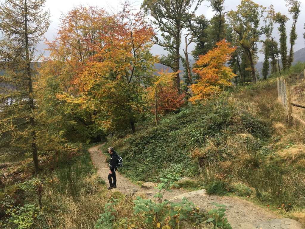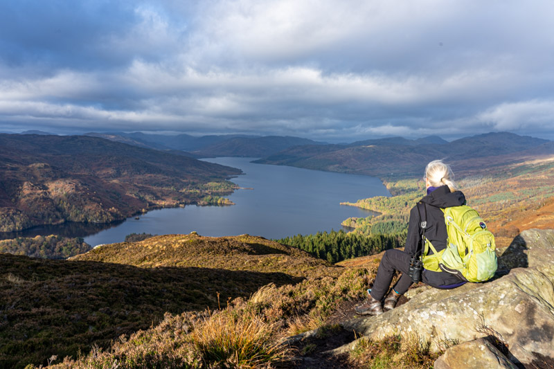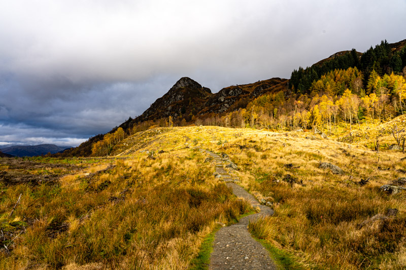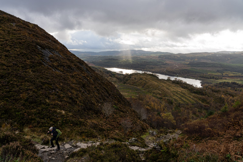 It’s a steep climb, the view behind us opening out, sun rays silvering the surface of Loch Achray. Dark clouds turn the light to that of early dusk, deepening the colours around us. The only sounds are the tap of my poles, the click of small stones under my boots and the chirrup of a small bird that flits around me but won’t stay still long enough for me to identify it. Some oaks are surprisingly still green, leaves curling brown at the edges, but most are in full autumn dress, dark yellow and golden brown. A small copse of birches glows bright yellow and tiny splashes of colour line the path – a tenacious strand of purple heather, a few ruby red berries.