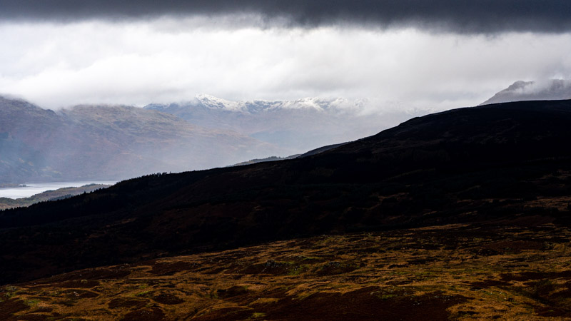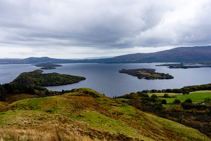 We leave the wood and the path steepens, big steps and rock scrambles, a mountain stream falling beside us, the cone of Ben A’an directly above us. The way ahead is steep and slippery and we know we must turn back. Disappointed, we do so, then realise we missed the path which has stepped across the stream. We continue our climb with some scrambling but the path is easy to follow, breaking out to a flatter section. We crest the final saddle and the view is stunning. Dark clouds hide higher, farther mountains, but the hills around Loch Katrine are clear and the water stretches long and dark, unlit by sun, a sliver of white boat gliding across it.