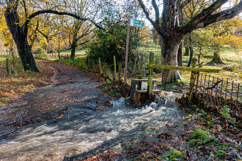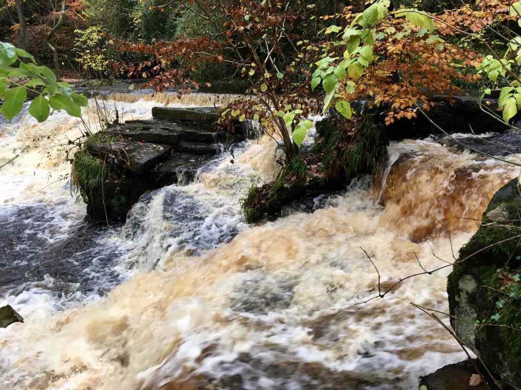The decades have wrought change, the woods encroaching on the grassy space, the undergrowth thicker and more tangled than it was when we hunted lost balls in there. The river is also changed, but this is due to the persistent rain rather than time. I stand and stare at it in amazement, a racing frothing torrent that has flooded banks and buried stepping-stones. The weir which would trap the ball when Dad batted it into the river is almost invisible, water that normally trips and stumbles over the cobbled surface now barely noting its existence. The race lives up to its name, the current strong enough to knock over anyone, let alone a child. A woman joins me and we chat – she walks here regularly (of which I’m envious) and we agree that this is the highest we have ever seen this river.