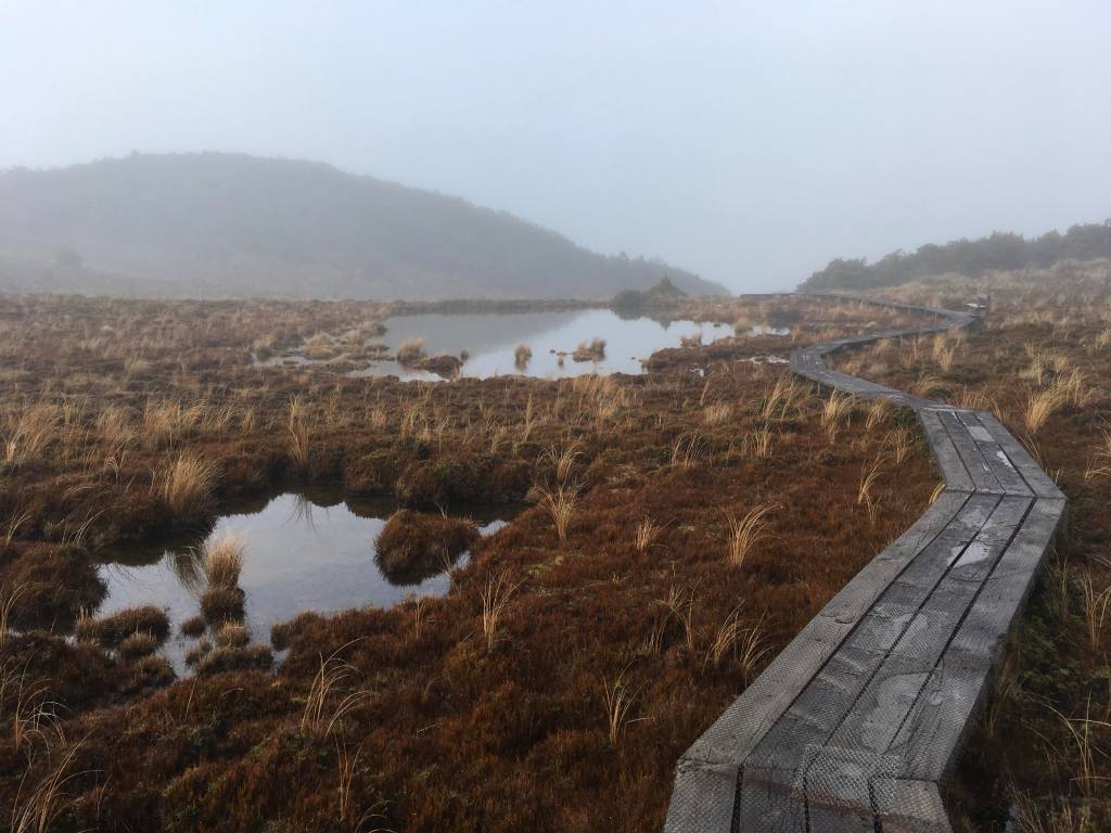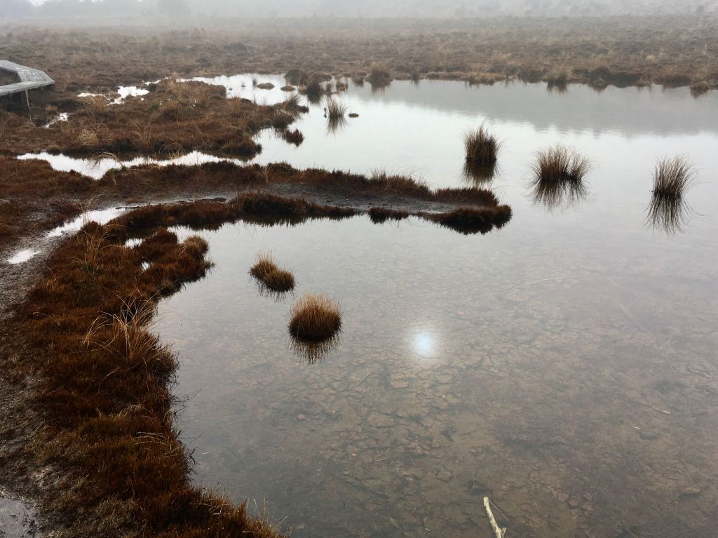After a km or so the path breaks out to open ground, a small patch of alpine wetland, the boardwalk zig-zagging across it to protect the delicate plants as much as to facilitate a dry crossing. The mountain looms to our left but hides behind the cloud that drifts around us. The small Rotokawa pools can offer a perfect reflection of him but it is a rare phenomenon, relying on a clear sky and no wind, the irony being that a wind is usually required to shift the cloud and even a slight breeze obscures any detail within wobbly watery ripples. Today is a rare calm day, the water mirror-still, but the only reflection is of the grey sky, a silver orb evidence that the sun is there somewhere.