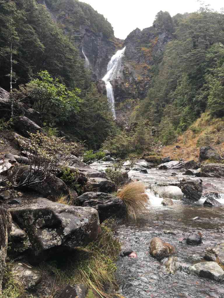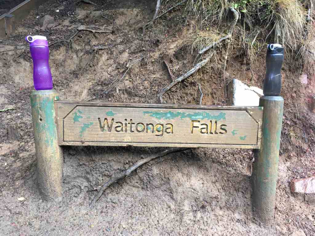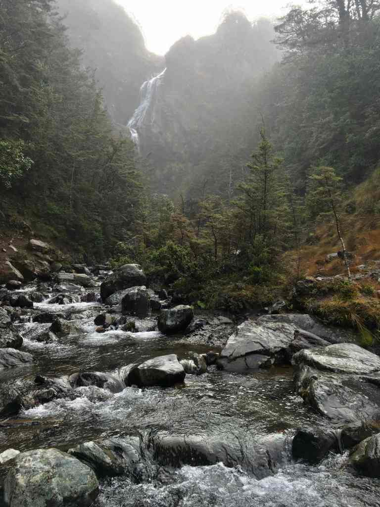 The Waitonga Falls Track is halfway up the mountain road from Ohakune to the Turoa skifield. It’s part of the longer, four-day, round the mountain track, a popular short walk and, as such, well-maintained. The car park is shrouded in mist, an occasional brightening of the sky suggesting we might be close to getting above the cloud. It’s about four km to the Falls and back and the sign says an hour and twenty minutes return. We can march it in an hour if we want to, but we rarely do. It’s a lovely track, through beech forest, a brief exit to cross alpine wetland via a boardwalk, then down to the base of the eponymous waterfall.