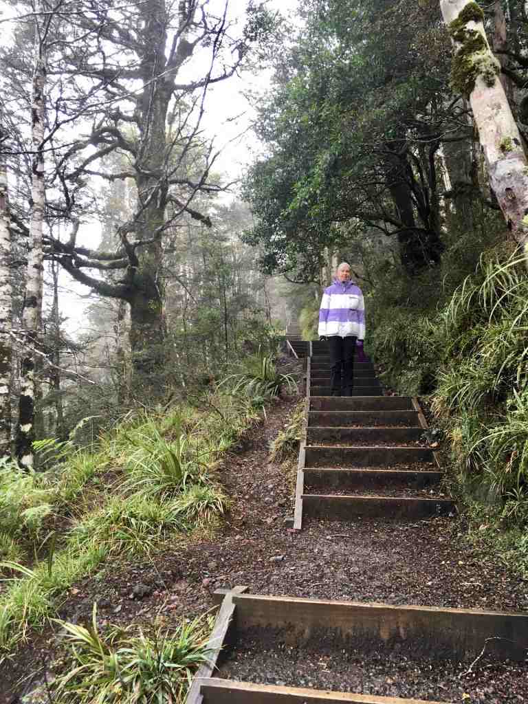 From the road, the wide track disappears into the trees and any heat from the vague and intermittent sun immediately disappears. It crosses a bridge over the young Mangawhero – which rises farther up the mountain and passes through Ohakune before it will eventually spill into the giant Whanganui – then climbs steadily into the forest. Slender trunks of silver beeches mix with the sturdier, moss and lichen-covered trunks of the mountain beech and the twisted trunks of kaikawaka. Ferns line the track, bright green against the wet mulch, droplets of water captured along their edges. It’s an ethereal scene, misty rain hanging in the air. Large drops plop from leaves, one landing right down the back of my neck, making me jump and squeal.