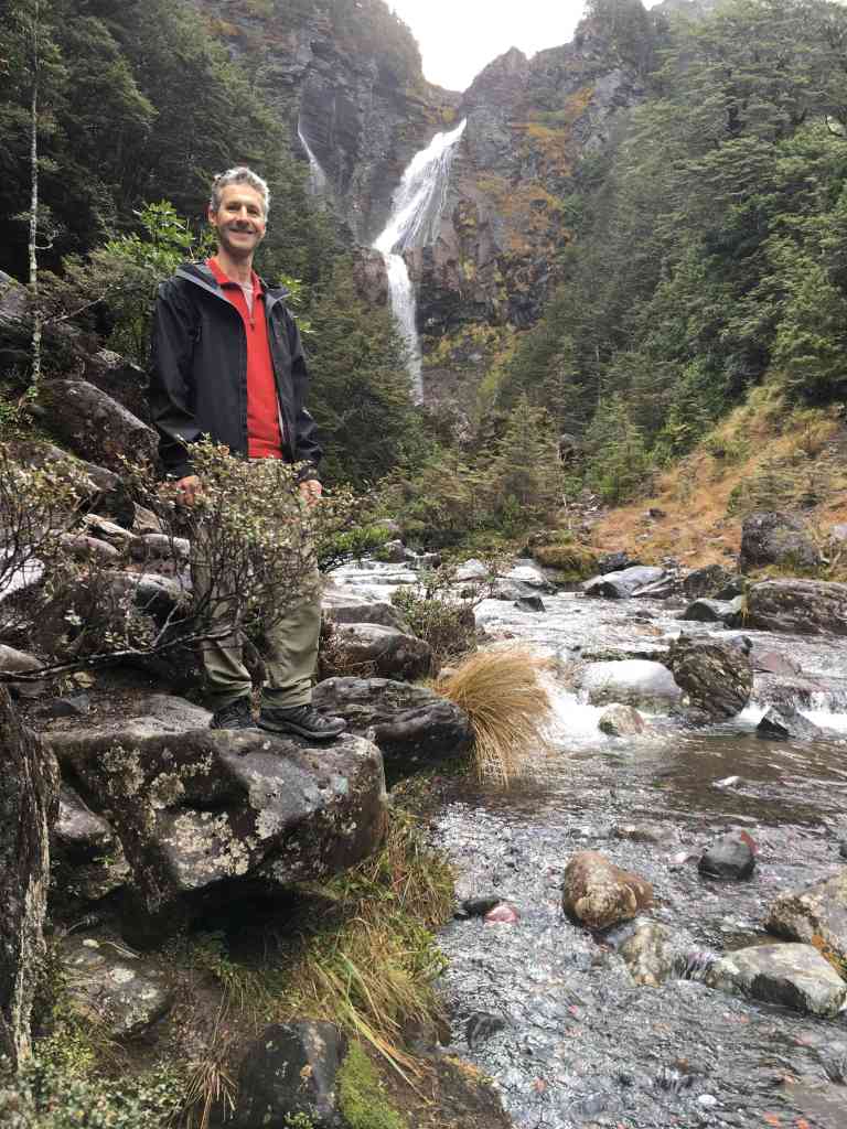 A final twist in the path and the stream is directly below us, the water appearing from a dip in the edge of the cliff high to our left. We clamber down the rocks to the water’s edge and gaze up. Waitonga Falls is something of a misnomer – the stream certainly drops from a great height but, for most of the way down, it doesn’t actually fall, instead sliding over the rocks, dropping into air for only the last few metres. As with most streams on this mountain, the flow varies dramatically, spring the season of snow-melt when it tumbles and gushes, the trickle of late summer often a mere whisper of white against the rock.