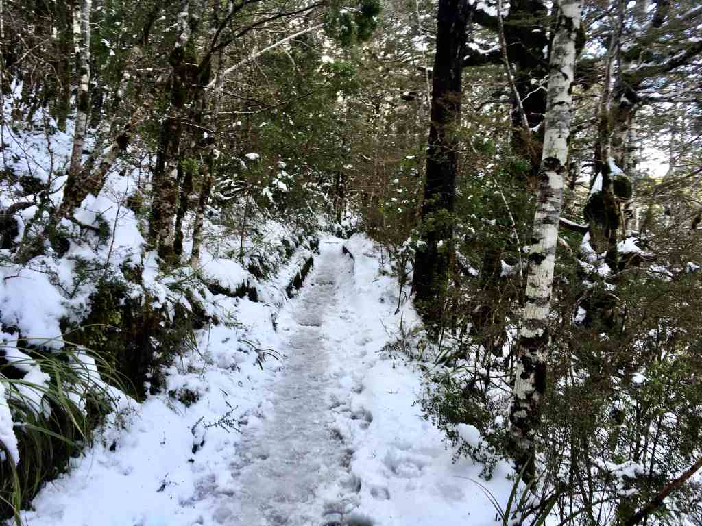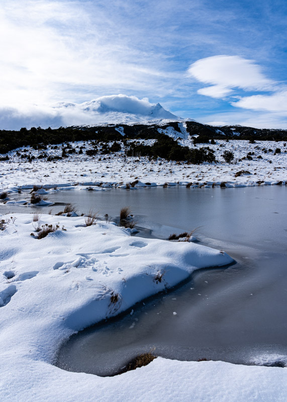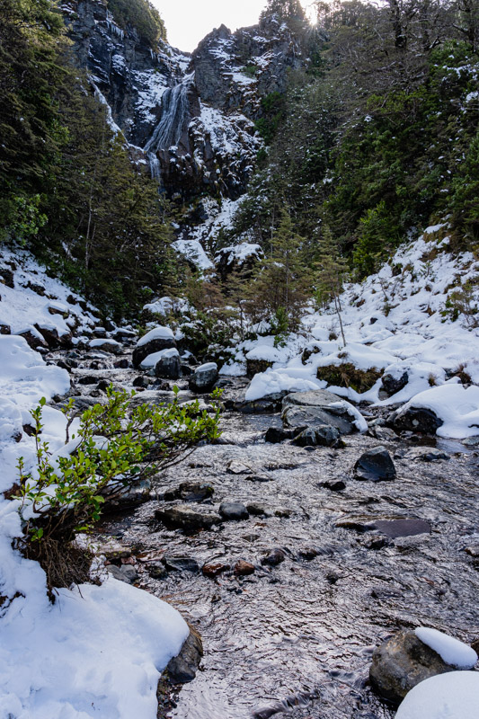 Some years ago a work colleague told me of a winter skills course they’d been on, the first lesson being how to walk on snow. Until then I hadn’t really thought that you don’t walk on snow or ice the same way you walk on any other surface, not if you want a chance of staying upright anyway. Heading towards Waitonga Falls, it takes me a slippery couple of hundred metres to get my legs back into the habit they’d picked up as a child, carefully planting my feet rather than treading lightly, making no sudden change of direction. I remember that brown (no snow, no problem) or white (soft and therefore the tread on my boots creates a hold) is okay, grey (packed hard and frozen) really not, and anything translucent means a layer of frictionless ice on top so avoid stepping on it in the same way you would a cowpat.