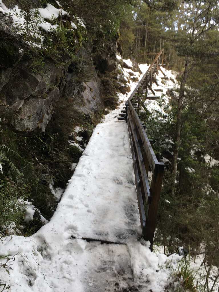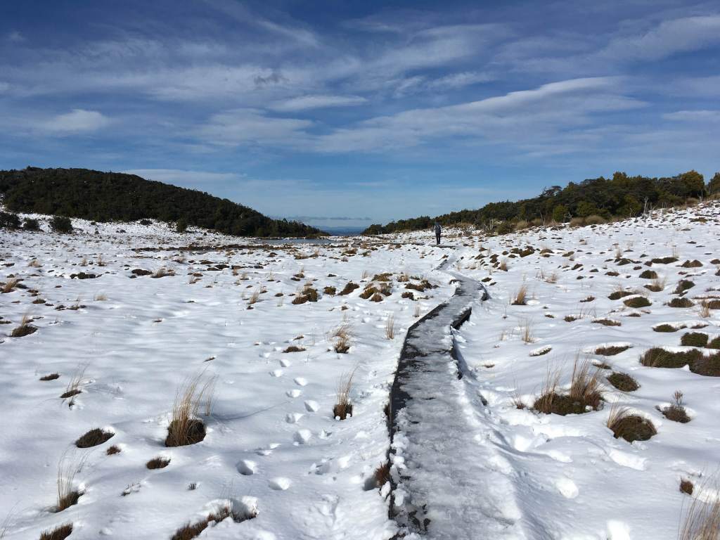 We re-trace our steps, fighting the wind and sleety rain across the boardwalk, easier than when it was behind us and trying to topple us. We negotiate our way down the path slowly, avoiding the middle and using the thicker snow at the edges as a brake. On the section where an extended walkway skirts a large boulder the planks are iced and slick. A child stomps down, his rubber-soled boots sticking where adults’ hiking boot soles don’t. I cling onto the handrail as I ski my way down it, otherwise I’d be doing it on my bum. We make it back to the car with no injury, to pride or otherwise, and peel off layers, then drive back down the mountain to the snowless station café for a coffee. The snow is forecast to return at the end of the week. We’ll still be here and I’m looking forward to it.