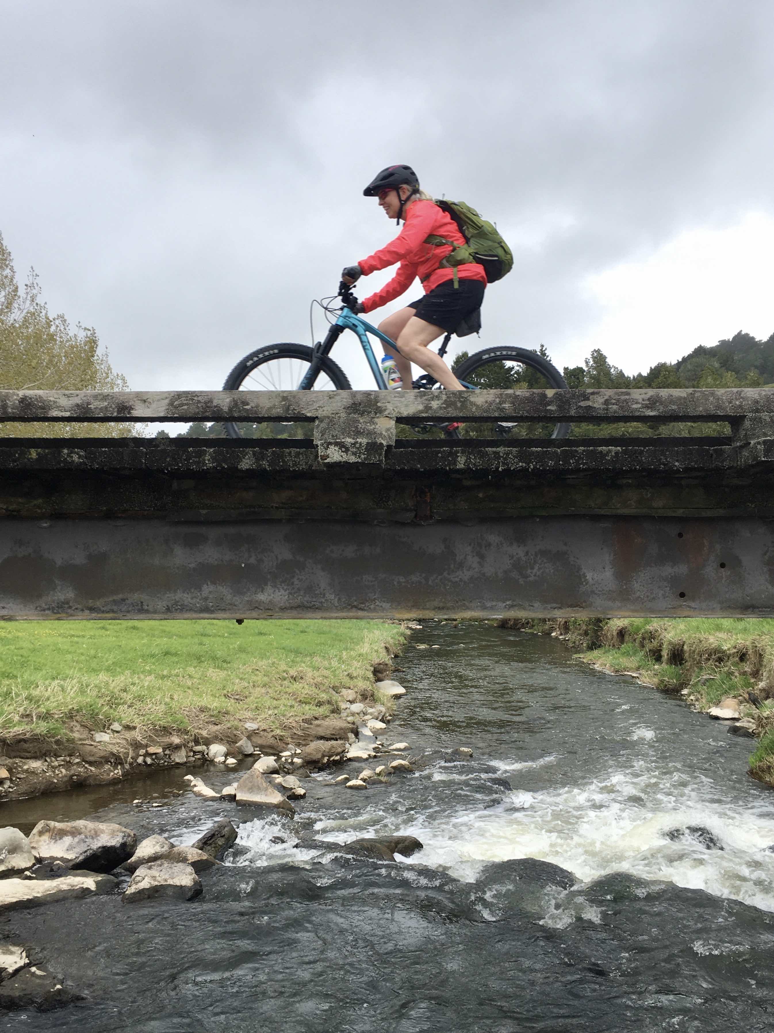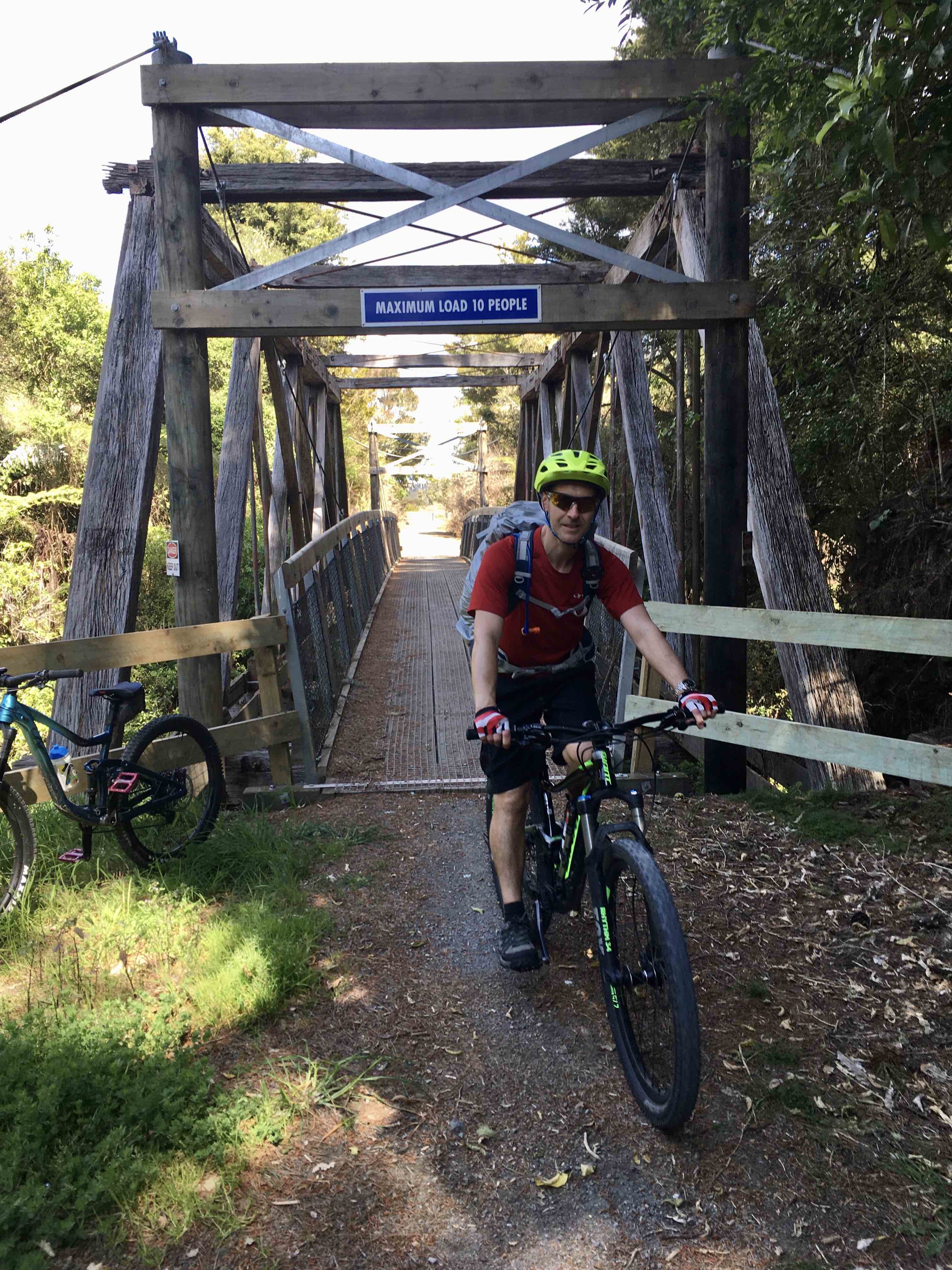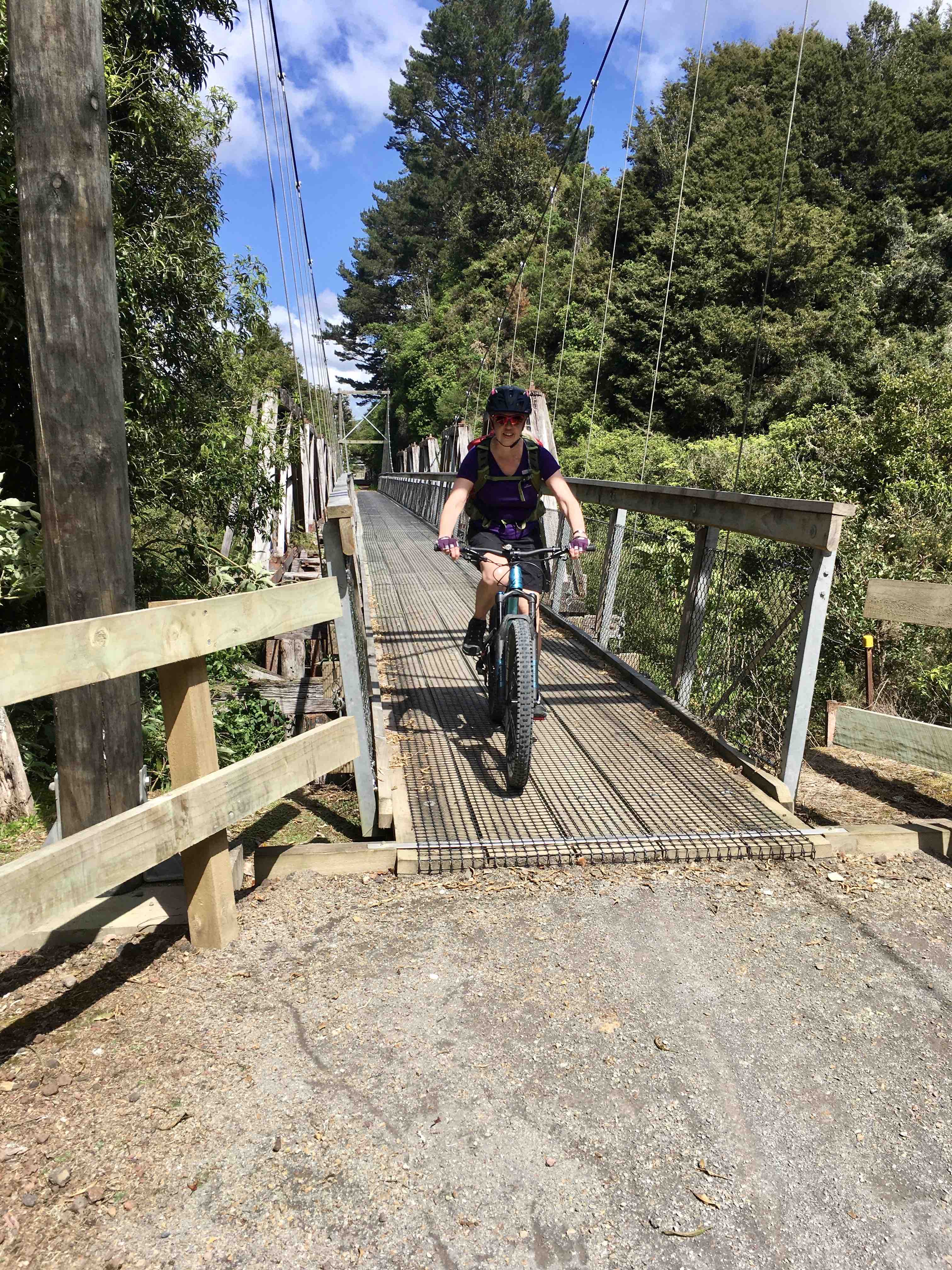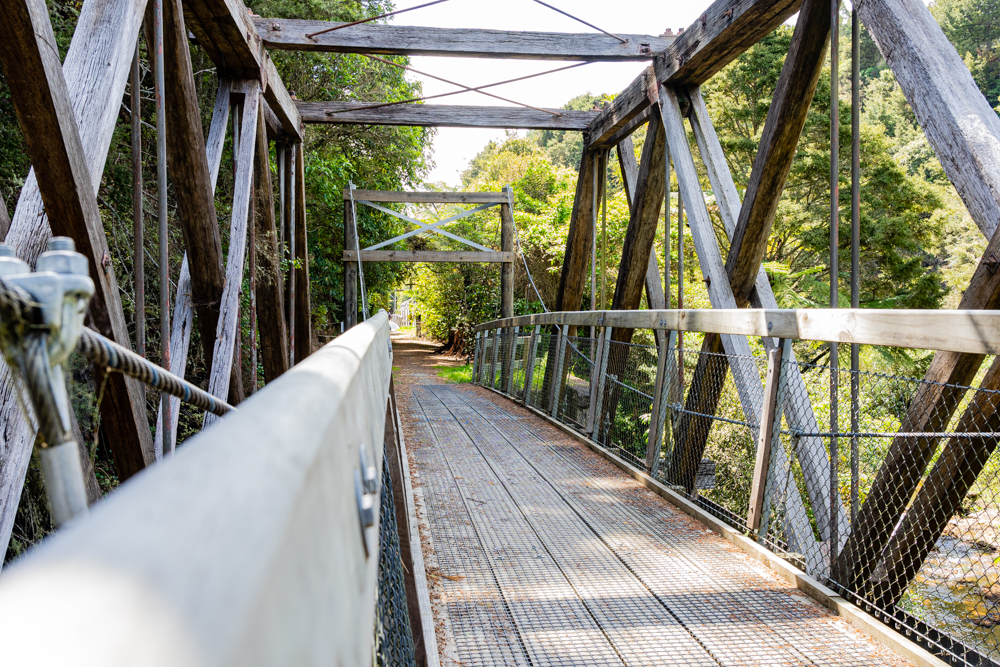 Day Two. The first half runs through farmland behind small towns, an easy and pleasant ride with the sun warm upon us, then through a series of cuttings to cross a couple of impressive suspension bridges over the Orauta (Oh-roe-tah) Stream. On a raised section huge chunks of the track have fallen away to the lower marshy land alongside, eaten away by the storms that flooded the area. We manoeuvre around a friendly team and their vehicles as they work to repair it. I wonder if the water that trickles across the flat land a couple of metres below us is normal, or if we should be looking at fields of crops and grazing animals.