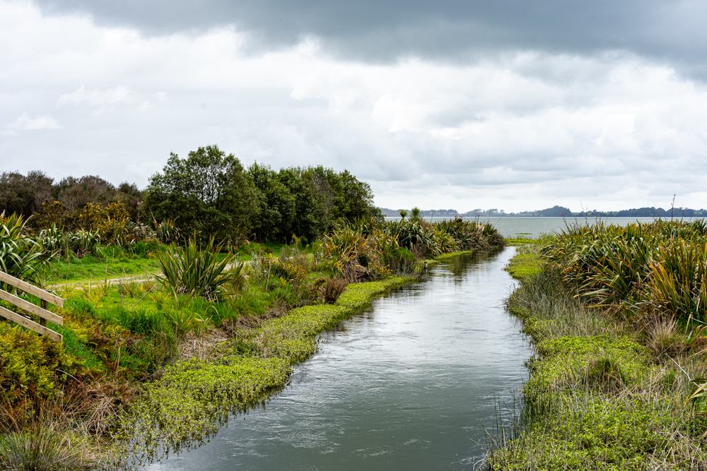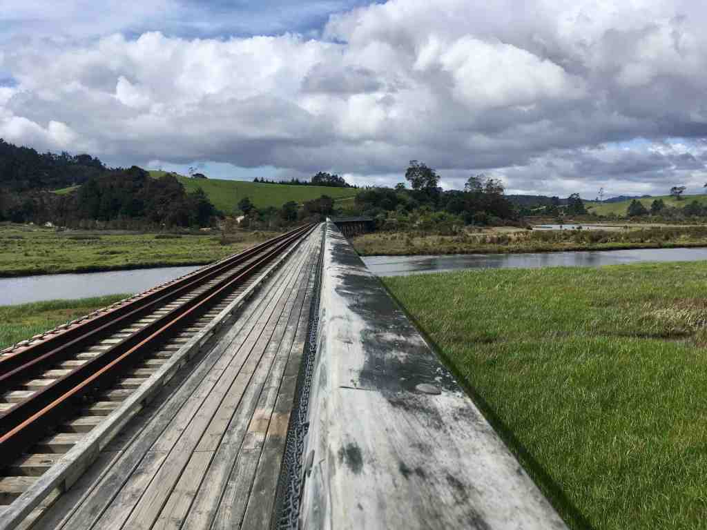 We cycle out of town beside the rail line through more farmland, attracting the attention of a magpie, a cyclist’s hazard in spring. I’m on a flat track with no obstacles, or the thump on my helmet (which feels like someone has thrown something at me) might end differently – me in an untidy heap on the ground with, given my track record, an injury of some sort. I throw a few swear words after it. At Taumarere (Toe-ma-rare-ay) the train line ends at a spectacular curved viaduct that crosses rivers of bright blue water meandering through wetlands, grey-green grasses and reeds waving in a fairly stiff breeze. I watch a pukeko (poo-kay-ko) pluck a small eel from the water, which puts up a brief fight then hangs limp as the bird disappears into the long grass.