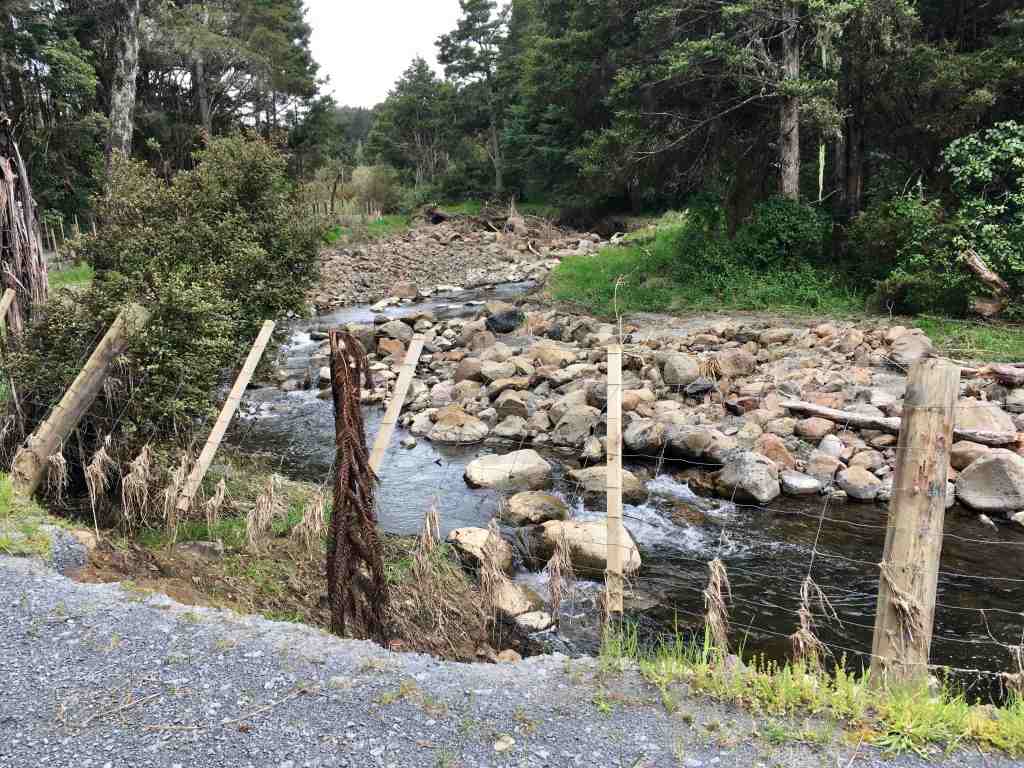 We’re damp as we ride into Okaihau (Oh-kai-hoe), characteristic small-town New Zealand, with a main road boasting a few shops and a garage. There’s also a small café, with surprisingly good coffee (amazing how easy it is to find bad coffee in NZ) and ‘the best chocolate cookie I’ve ever tasted’ declares Neil, buying a second one to take away. Re-fuelled we cycle out of town alongside the road and a couple of historic churches for a few km before swinging off to ride a gradual descent between fields, tall stands of bamboo shelter-belts marking boundaries. It’s a fun section, the track mainly smooth, but gutters and deep runnels across it evidence of the huge storms that swept through this region recently. We drop steeply down a hillside to a wide valley. As I swing around a curve I pull over in amazement where the fence hangs in mid-air over the torn banks of the river. The side is washed completely away, twigs and grasses trapped on the lower wires of the fence showing how high the water reached, large trees abandoned metres above today’s waterline.
