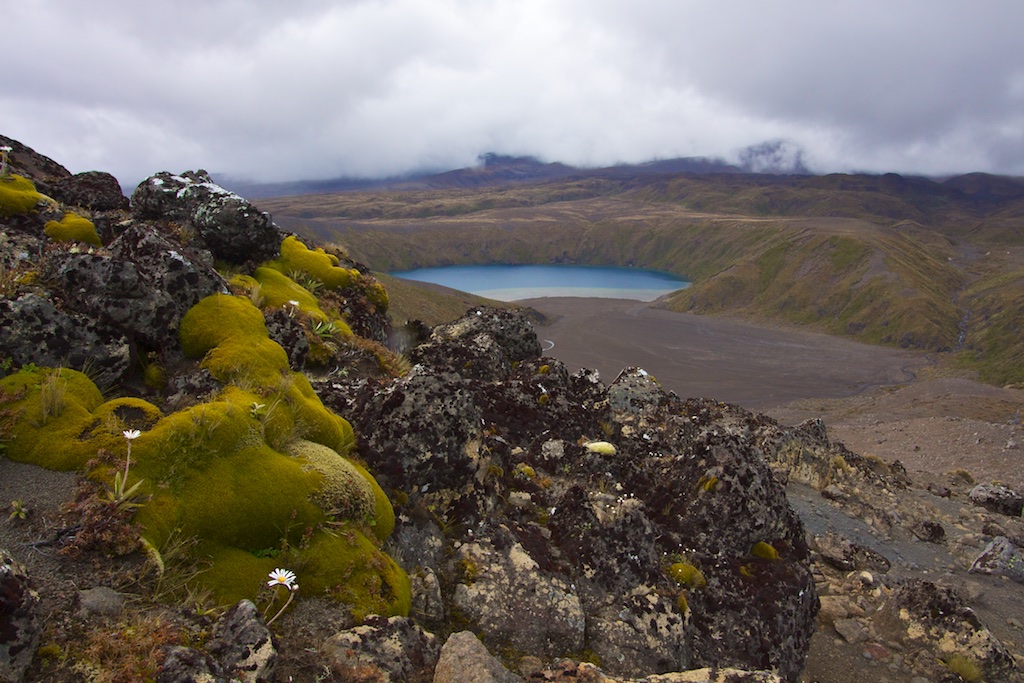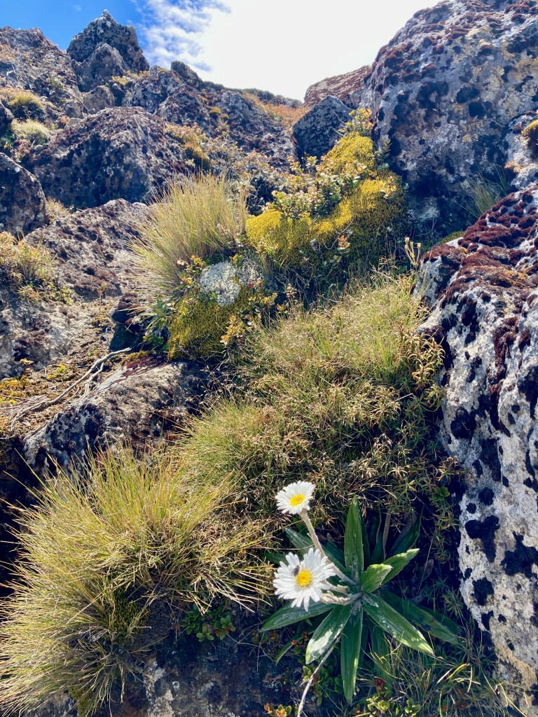 The path swings left, away from the cliff edge, becoming a deep rut etched into soft peat-like soil in a fold of land that provides some shelter from the wind and allows low-growing plants to thrive – tussock grass that lashes my legs like a hundred tiny whips; a small-leaved hebe that looks, and scratches, like heather. Vegetation dies away as the land rises, a vague track visible up a steep and slippery scoria covered slope. I take a deep breath and start up – every time we do this walk I say I won’t do the final climb the next time; every next time I scrabble my way up and down it with my heart thumping, always relieved when I’m back amongst the leg-attacking hebe and tussock. Each footfall is a gamble, the surface so loose that you risk a slip that will send you spilling painfully back down. Spots of colour glow amongst the grey: a carpet of mustard-green moss coats a leeward slope and red-brown lichen clings to rocks in whose cracks a mountain daisy shelters, its broad leaves a low flat star.