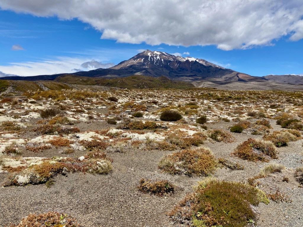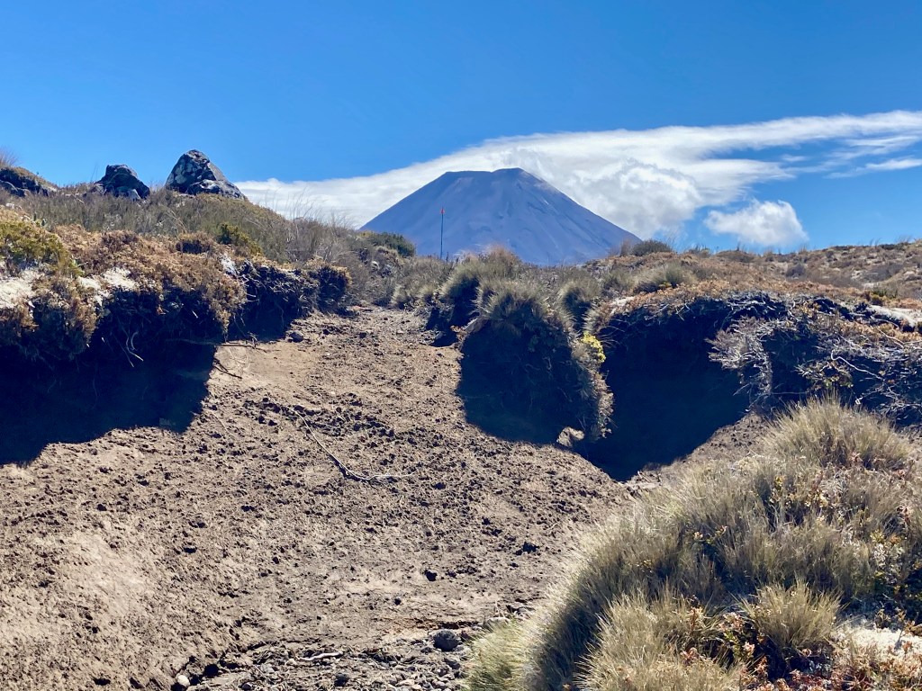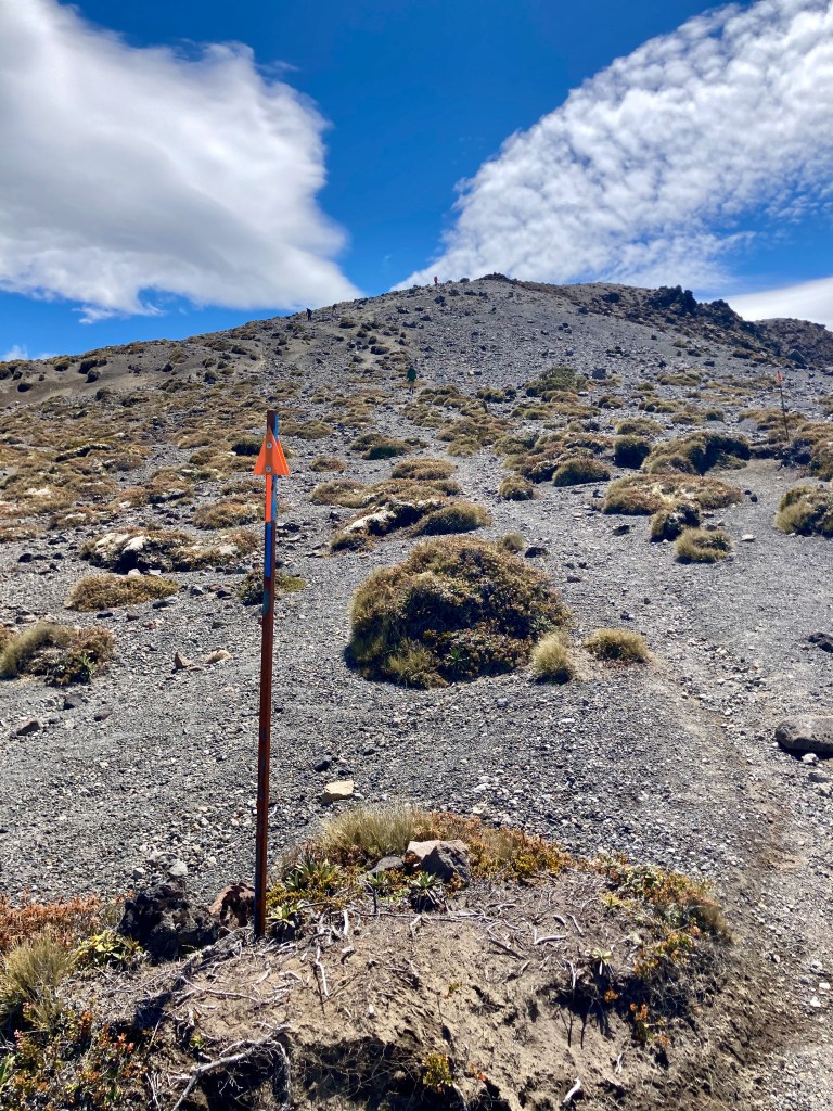 This is my kind of landscape, open and wild, above the treeline after the first couple of km, views for miles and in the shadow of two mountains, Ruapehu to the south, Ngauruhoe to the north. To walk with both in full magnificent view is to walk in paradise. Albeit a paradise between two active volcanoes, one of which is currently suffering a little indigestion and might well burp at any moment. Thankfully we’re well away from any valleys down which lava might flow, although we might be in trouble if he starts hurtling rocks and hot ash at us. (In all seriousness, the current level two grading is the same that Whakaari was at in 2019 when so many lost their lives or were horrifically injured by hot ash.)