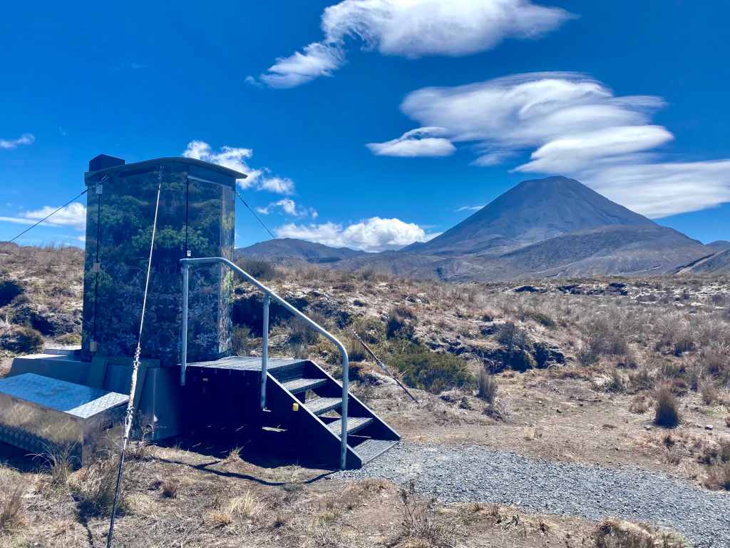 Today is a beautiful day, the wind a little fresh, meaning we need an extra layer against its chill, but the sun is out and both mountains outlined against a cerulean sky. There are a few changes since we were last here a couple of years ago: a wire fence blocks access to the top of Taranaki Falls, although I suspect the committed Instagrammers wouldn’t be deterred, and a couple of toilets have appeared, cleverly covered in fern decals to blend into rather than blot the landscape. They are also securely anchored by cables – winds in this area can be fierce. We turn away from the crowds towards Ngauruhoe, the track rising and dipping gently.