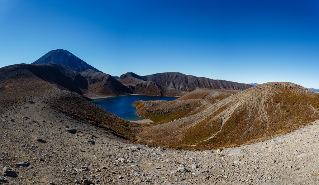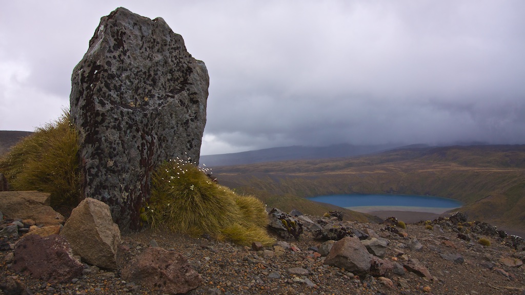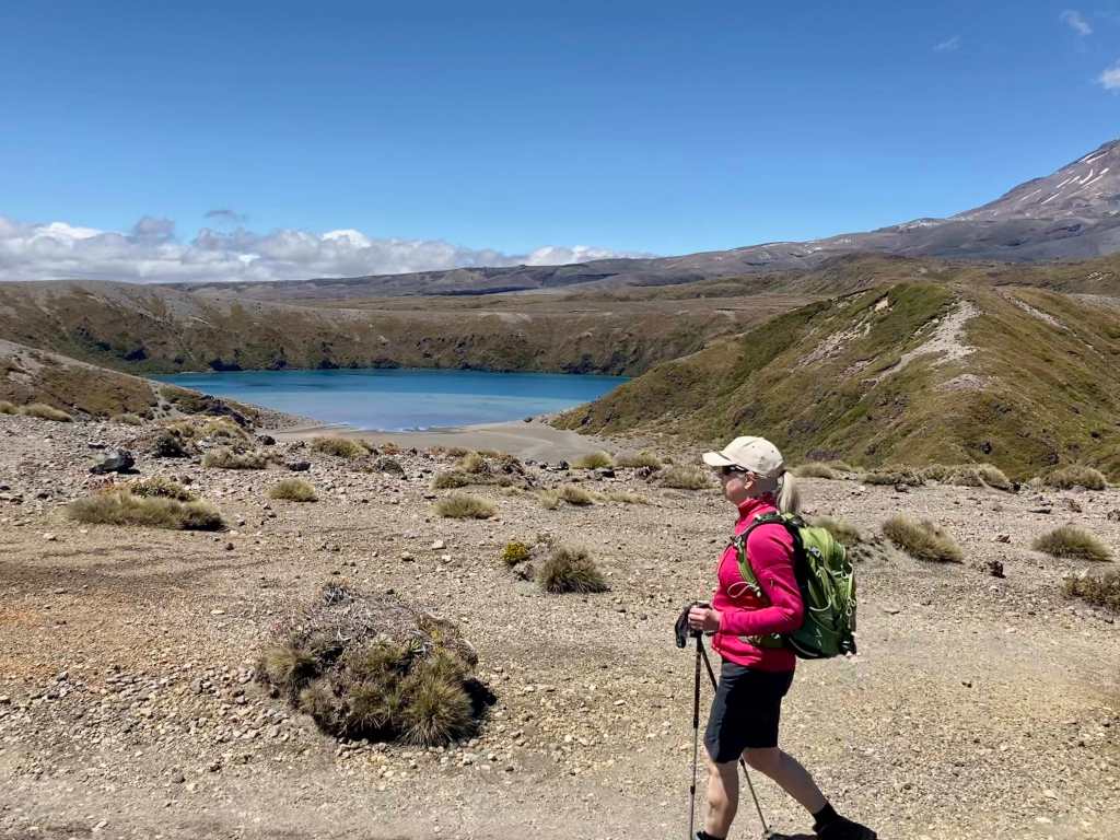 The wind gusts haphazardly, making the ridge tricky to negotiate. Even with my poles I fear a sudden blast that will unbalance me, the result a nasty fall over some rough terrain with little to arrest me before a couple of steep drops. After another scramble upwards we crest the final saddle to the huge rock that marks the end of the track. Below us, the second lake snuggles against the side of Ngauruhoe. The view seems endless and it feels as though we are on top of the world, but the ceaseless wind buffets me from all sides and bracing against it is challenging. Neil is busy with his camera and, knowing he will soon catch me up, I leave him to it and begin my slow and cautious descent back to the easy track and a picnic lunch in the shelter of a low bush.