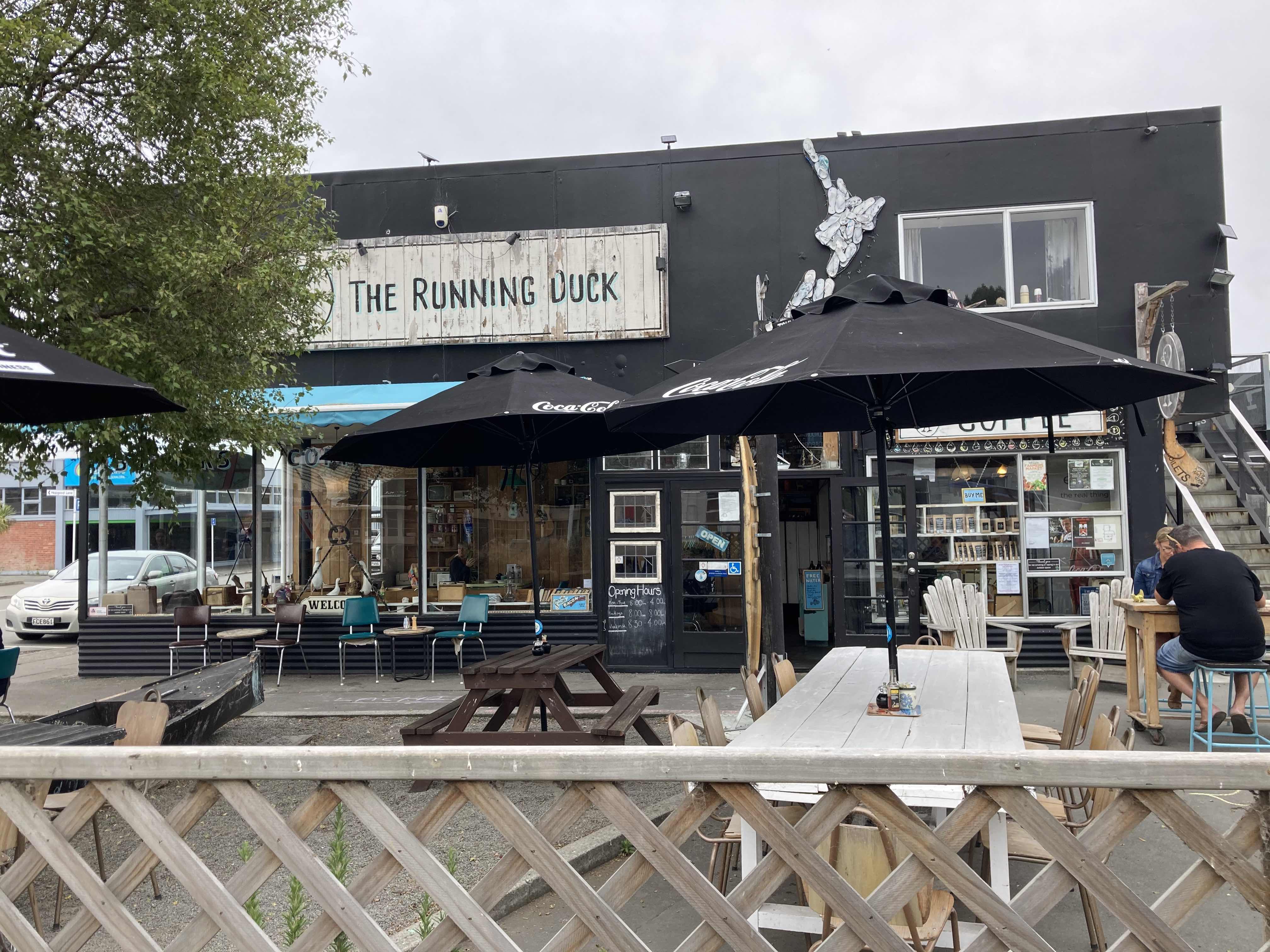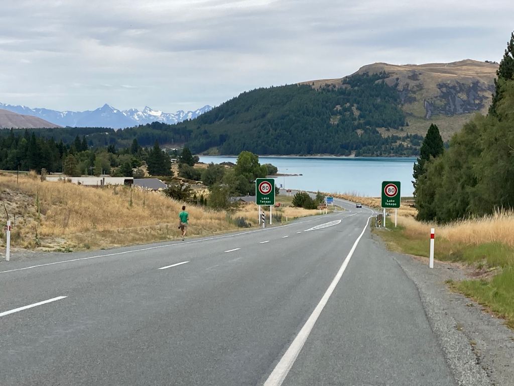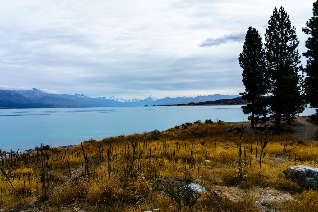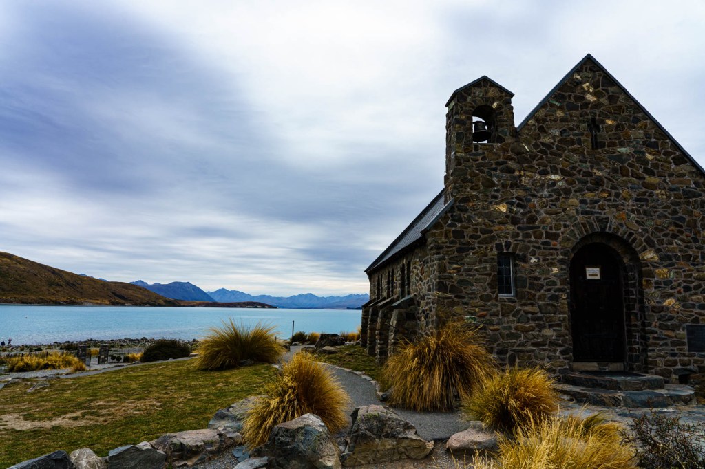 Day two begins in low cloud, misty rain sweeping into the windscreen, which soon clears to reveal silhouettes of hills to the north, dark masses hanging in valleys between them. A snow-streaked Mt Hutt behind catches a ray of sun and a rainbow briefly arcs across the cloud. We stop for coffee in Geraldine at the cutely named Running Duck café – when I ask where the loos are I’m told to follow the duck feet! We leave the flat of the Canterbury Plains and plunge into the hills, dipping in and out of small tree-filled valleys. Burkes Pass reminds me of the top of the Snake Pass in England, its windswept flats wild and bleak. We swing around Dog Kennel Corner (apparently so named in recognition of the importance of the sheep dog in the area) for the first glimpse of the Southern Alps and Tekapo sits before us, the church isolated on the banks of the blue-green lake. Today it is as quiet as it was nearly two decades ago when we were last here. Whilst I would never wish for a global pandemic, I’m glad I can enjoy the peace without the constant stream of tourists that usually crowds it, and who caused the church to close due to people fighting to get the perfect picture through its famous window.