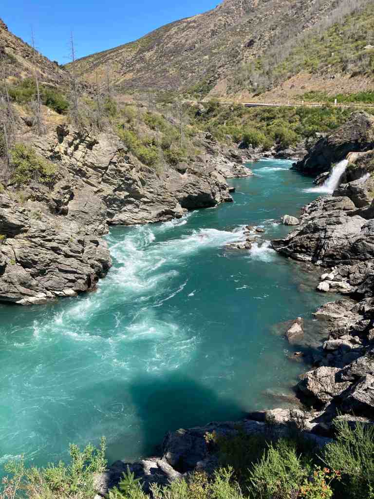 We drop down to the expanse of Lake Dunstan, created decades ago by damning the Clyde River further downstream, and swing over the bridge into Cromwell, with signs for vineyards at every junction – Central Otago pinot noir is amongst the best in the world. In the Kawarau Gorge we pause to look at Roaring Meg (reportedly named after a barmaid who, during goldrush times, used the force of her voice to maintain order in her bar), where the gorge narrows and the turquoise river, glowing against the rocks, storms through the gap. Grey ghosts of pines line the sides, the first step in the removal of these wilding pests.