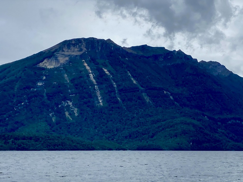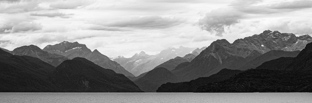 Lake Te Anau is New Zealand’s largest by volume, long and thin with unimaginatively named (north, middle, south) arms sticking out on its western side. (No one needs to guess how Sandfly Point got its name.) The water shimmers silver and the steep sides are scarred with horizontal stripes as evidence of their creation through glaciation. Three vertical scars look like a large animal has clawed at the cliff – maybe this lake has a taniwha (water creature in Maori legend). Close peaks are rounded, green and covered with vegetation, their backdrop the sharp grey granite jags of mountains that poke above the treeline, snow lingering in sheltered crevices. On a small island stands a cross in memory of Quintin McKinnon, one of the men who scouted the route for the Milford Track and then spent three years guiding early travellers along it. He disappeared on the lake in 1892, his upturned boat found but no body, and it is presumed he drowned here.