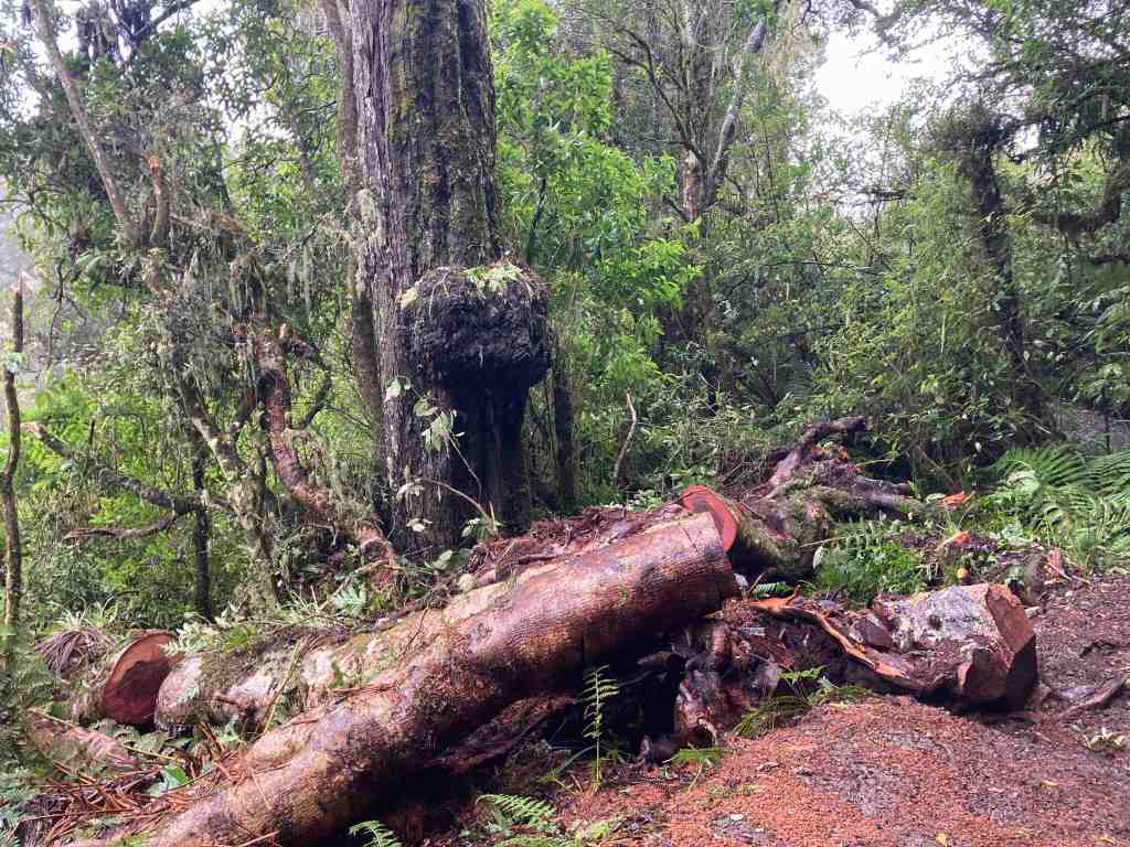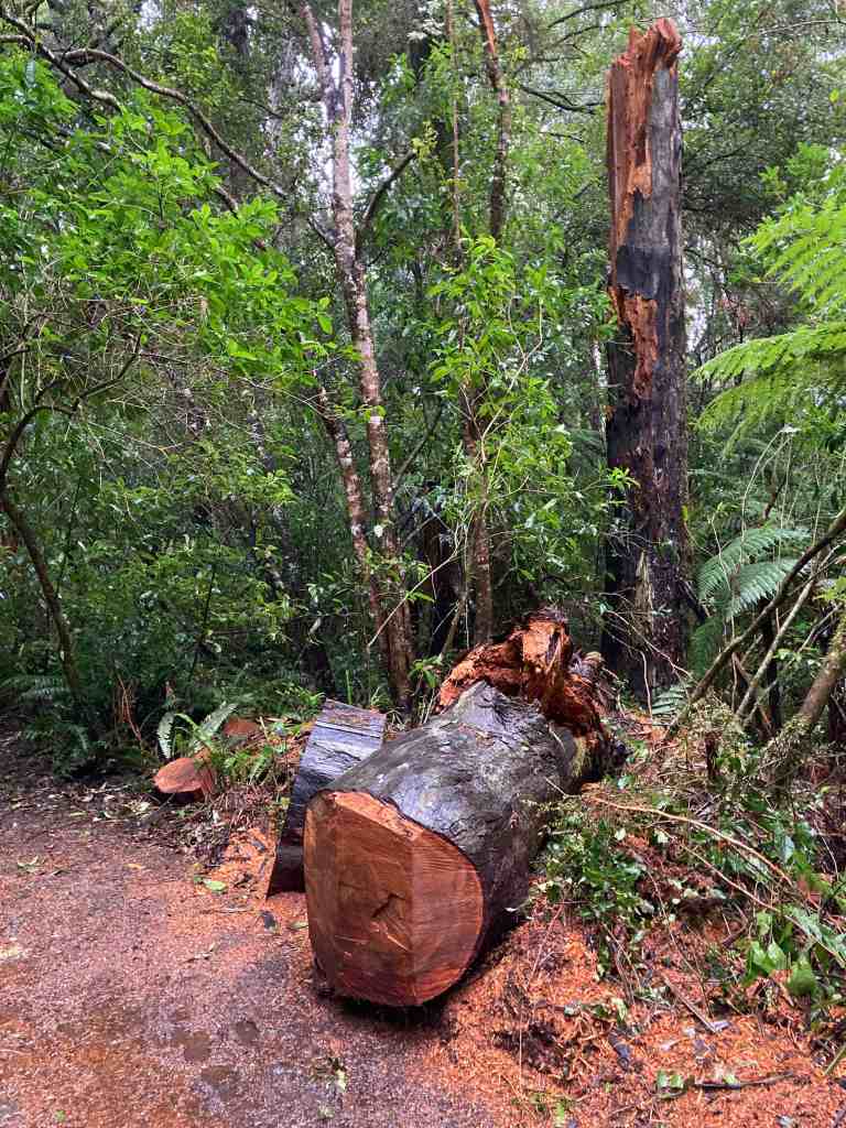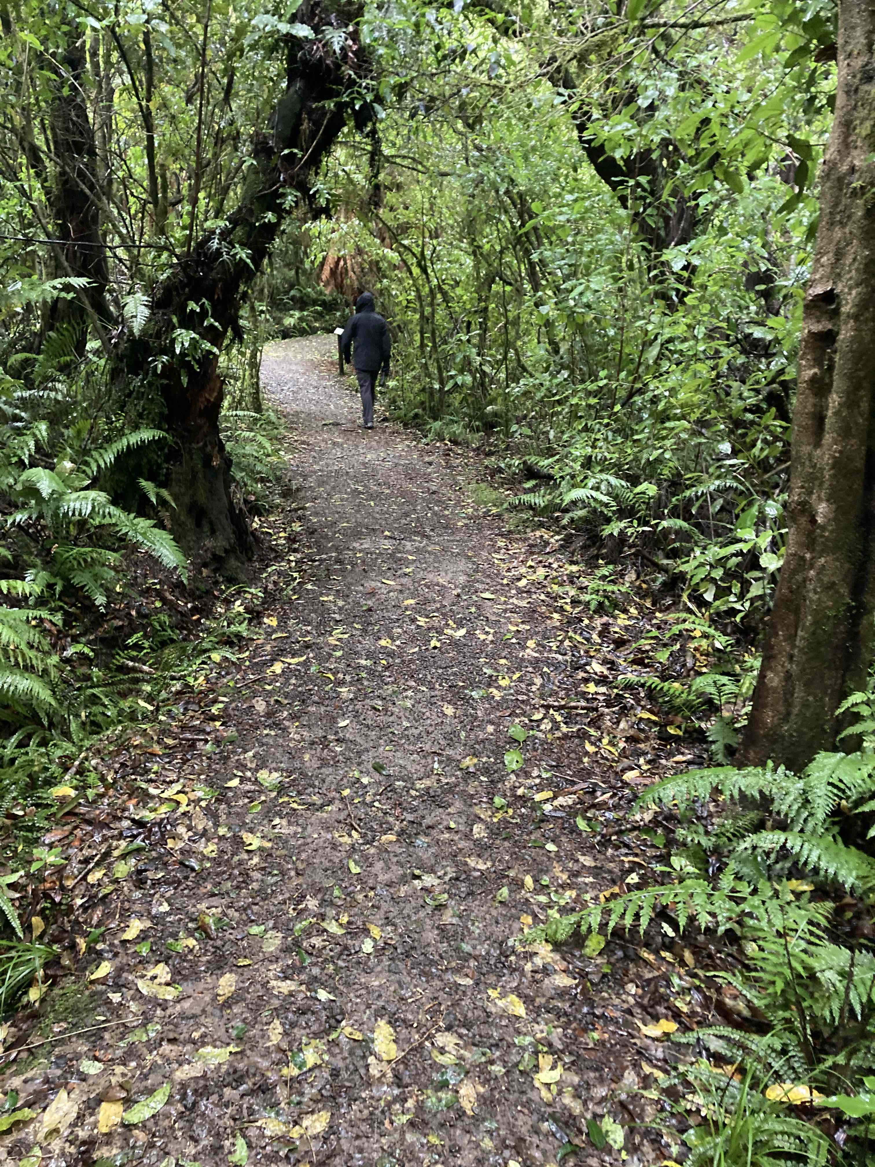 In the trees it’s hard to tell if it’s raining or not, huge plops of water dropping onto me. One splats right into the centre of my forehead and rolls down my nose in a small waterfall. The path is strewn with debris – snapped twigs and small branches, fern leaves torn from their anchor – and slippery roots to trip the unwary. I stretch over a puddle and my landing heel digs into soft mud. Freshly sawn chunks of log are rolled to the side of the path, the trunk they were cut from bleeding and raw at each side of the path. Above us a huge hole in the canopy is edged with broken branches, torn creepers and epiphytes hanging in disarray from them. There hasn’t been time to clear yesterday’s damage so this must have fallen in the storm of a couple of weeks ago that also took down a tree on our street.