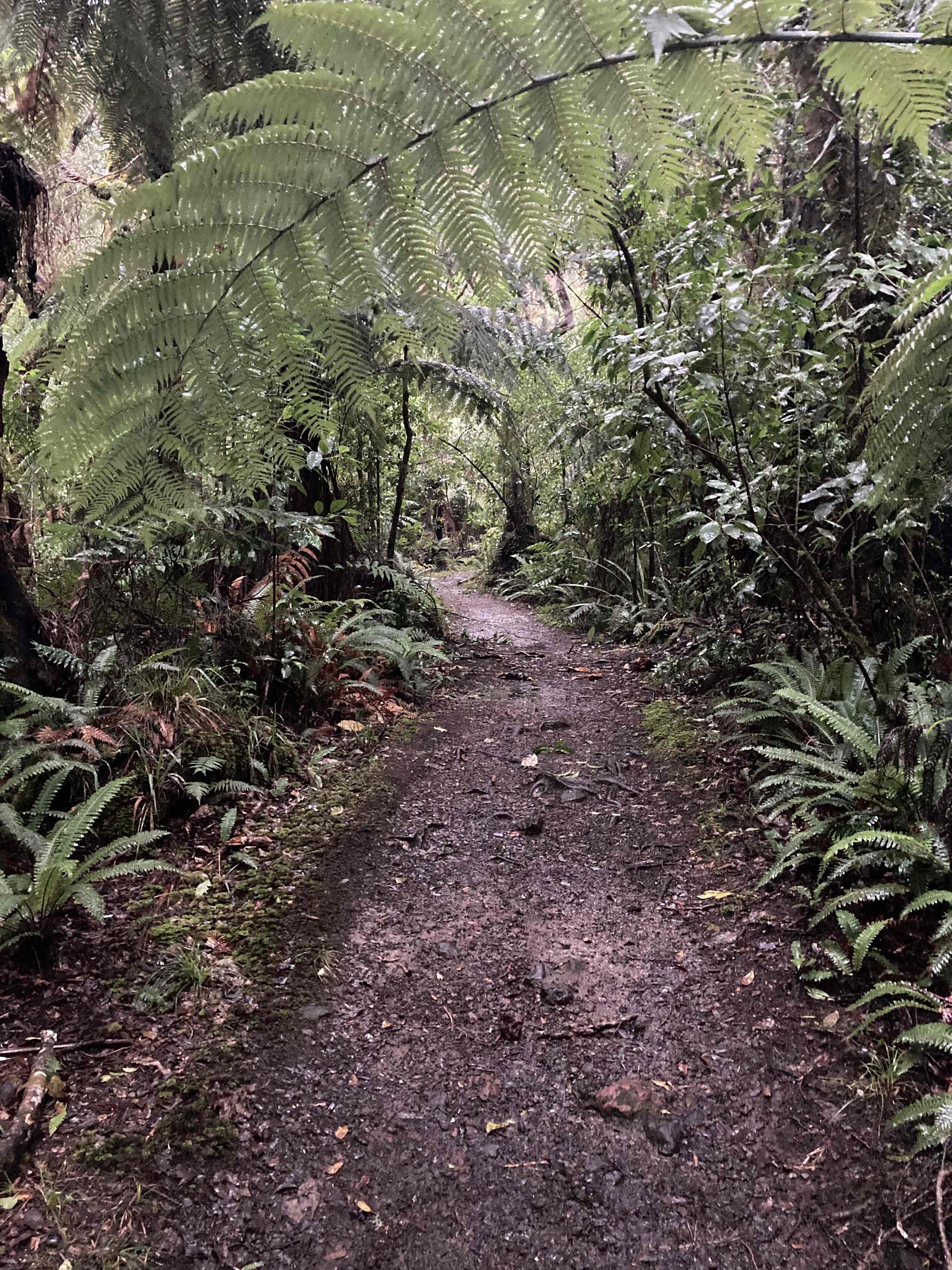 Cloud hangs like mist over the trees, fingers of it drifting across the hillside. The forest is dim but glows with the low light, a myriad of greens, wet and shining. Moisture is everywhere, sitting on leaves, running down dark trunks, wallowing in muddy puddles on the path. It’s no surprise, so much water pouring from the sky yesterday I thought these islands would sink. There was no letup, the rain and wind – severe gale in exposed places, said Metservice – joining forces, bending trees, flinging debris around. It was the sort of day when you’re glad to have the safety of four solid walls around you, peering at the storm through glass whilst the log burner glows behind you.