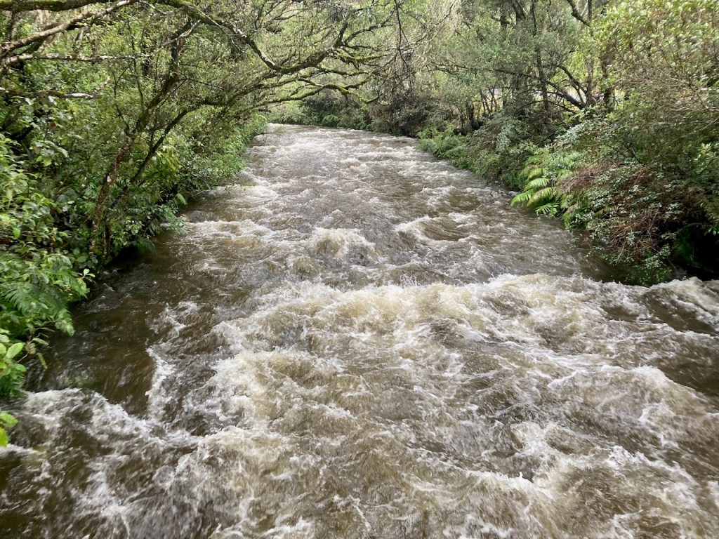 The stream that normally gurgles along at walking pace is swollen and dark, frothing and foaming like an angry dog. Soggy debris covers a boardwalk, built a few years ago after a flood washed away the path – clearly the water broke free again yesterday, pushing sand and broken tree parts ahead. A man grabs a child by its coat as they head for the edge of the fast-flowing water.