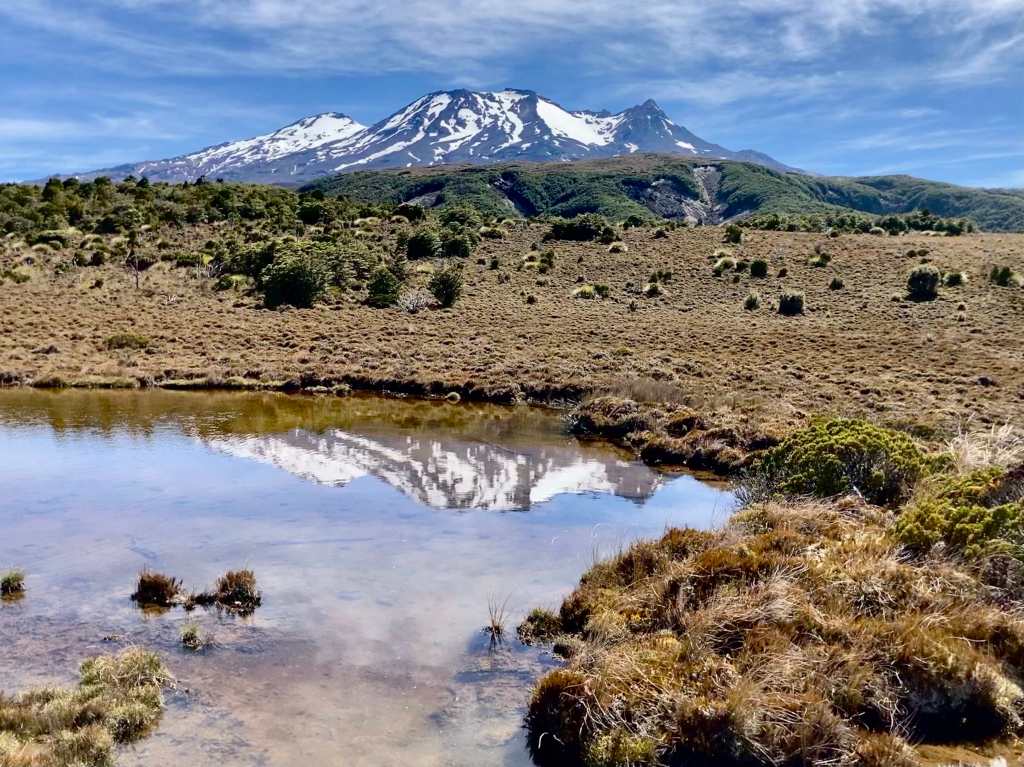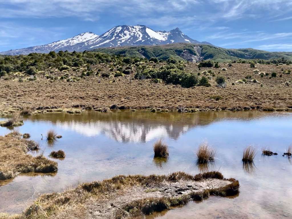 We’ve walked here many times, arrived almost at the crack of dawn to try and see the famed mountain reflection in the clear Rotokawa pools. But the wind also wakes early and likes to play with the water, running it into ridges to spoil a viewer’s fun. Today we were lucky. It wasn’t perfect, there were still a few wavers across the water’s surface, but it’s the best we’ve ever seen. These pictures are snapped quickly on my iPhone rather than being set up for hours (it often feels like it) by Neil on his camera, but you get the gist.