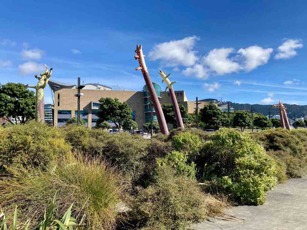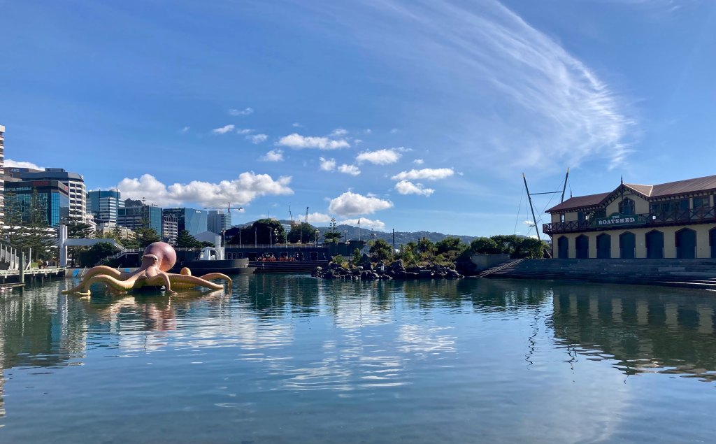 On Saturday we sauntered along the waterfront, admiring the artwork currently adding colour to the city. Sunday we walked over the hill behind our house, climbing through streets and along paths beside dog exercise areas, puffing up to where trees stand. At the top we caught our breath without fighting the wind for it, then scrambled down a rough path back to streets and through parks until we came to the south coast. We turned right and walked beside a sea that last saw land in the frozen south. On windier days a fine salty mist will shower you as you walk here but not this day.