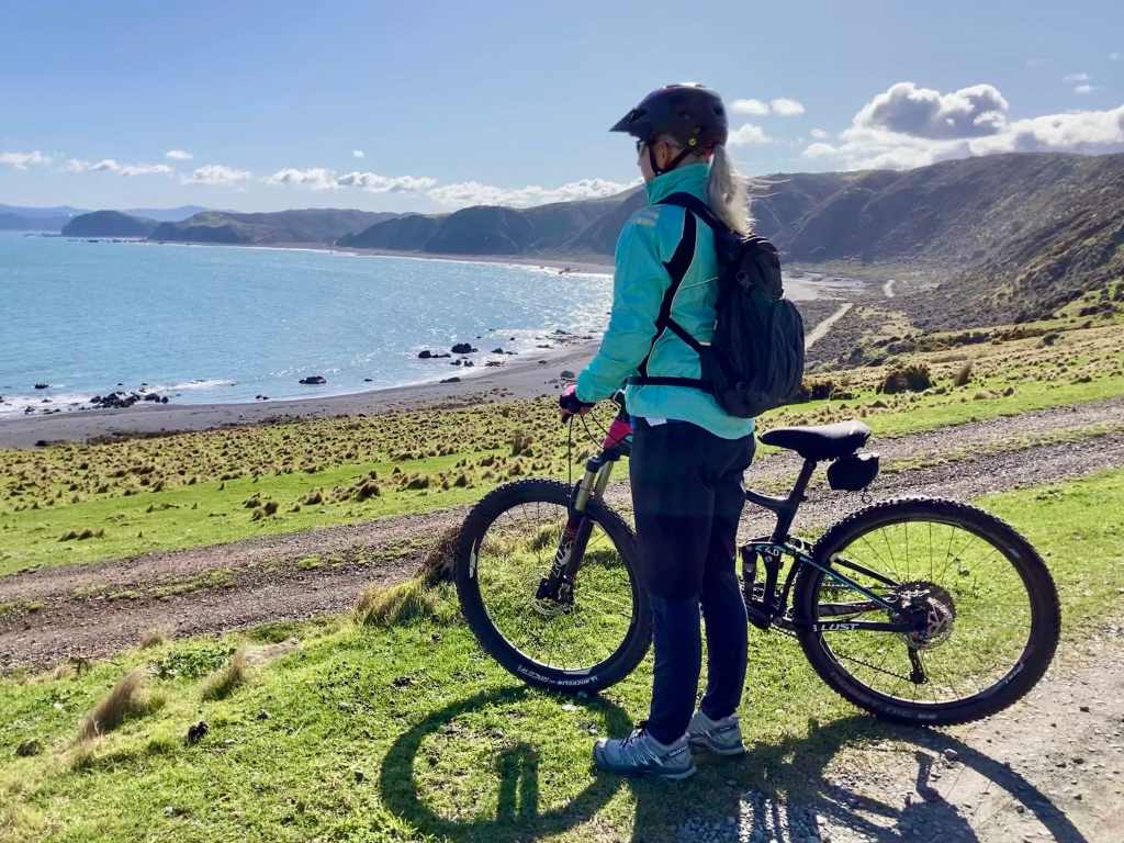 We rumble over cattle grids and I lock my wrists, elbows and shoulders rigid so to keep the wheel straight and avoid a nasty accident. Of course this means the jolt of the bars hits my joints like a sledgehammer. I’ll pay for that later. After an hour of relatively easy peddling the track divides, the path right continuing ahead to skirt the headland, the left going uphill to the lighthouse at Baring Head. Neil cycles, I get off and push until the gradient lessens and I can pedal without killing myself. Sheep pause in their grazing to watch as we pass but, unlike in many areas, they are used to visitors – we’re now in the East Harbour Regional Park and the southern tip of Wellington Harbour. Muddy tracks through the grass tell of how sodden the ground is and my wheels slip and slide, losing traction and wobbling me to a walk. It’s not much easier keeping my feet from doing the same and I giggle my way through sloppy mud and soggy grass, a sheep watching my progress as if wondering what the fuss is about.