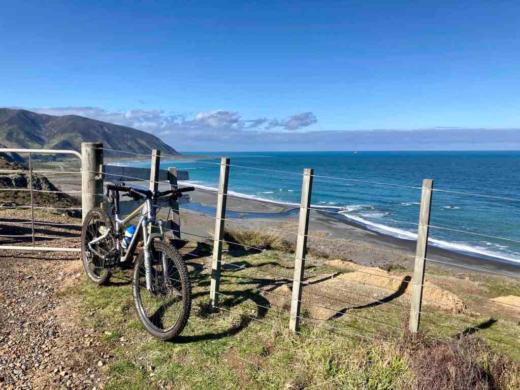 We pass the twin lighthouses of Pencarrow, one perched on a large rock on the shoreline, the other perched atop the cliffs above – some years ago we climbed the 100 or so hair-raising steps that lead to it and I don’t feel the need to do that again. At Fitzroy Bay the cliffs fall away where a gate leads to pleasant walks alongside small lakes, and the track dips slightly, poles alongside suggesting that it can be underwater when the tide is high. I pedal faster, just in case.