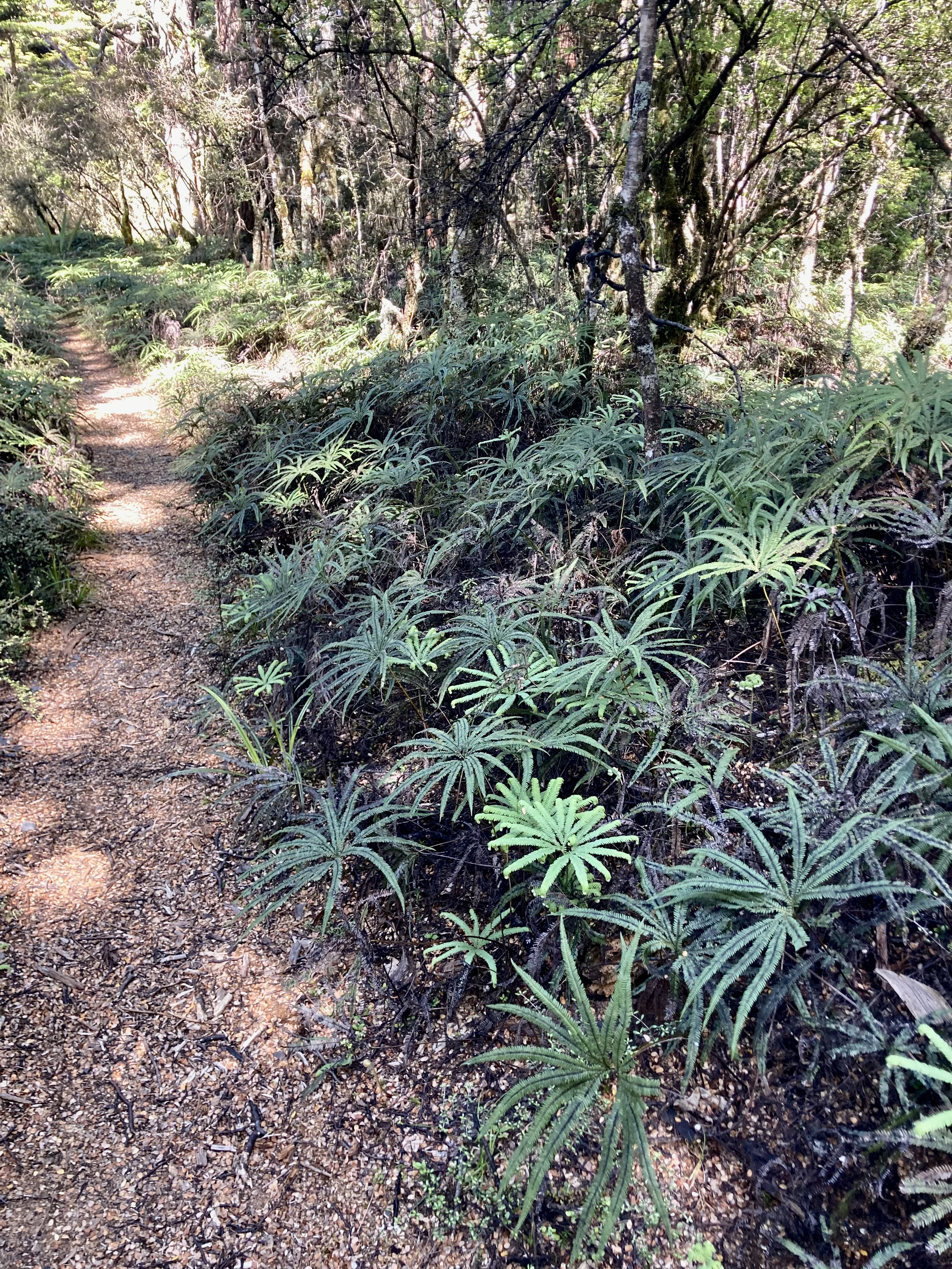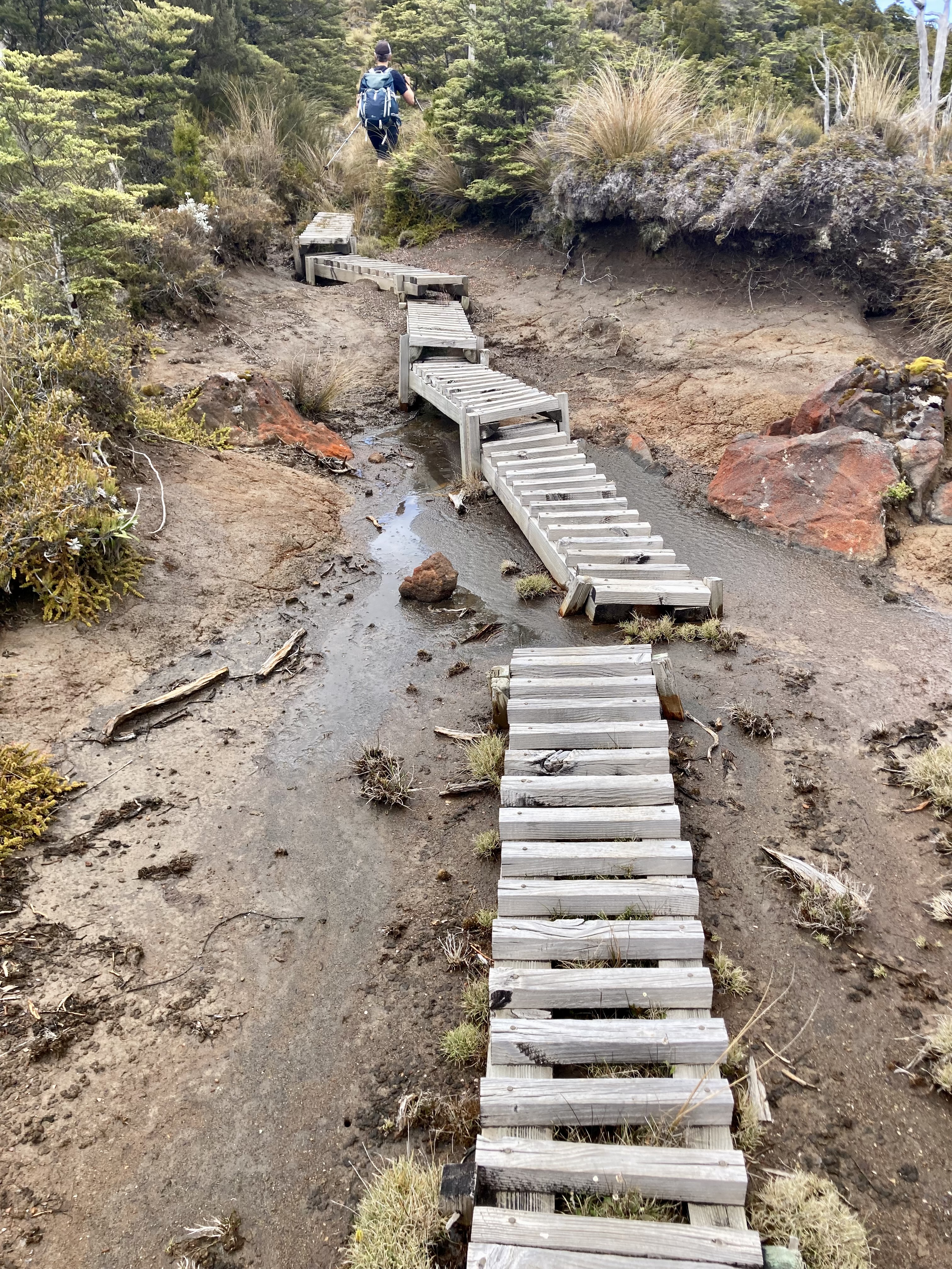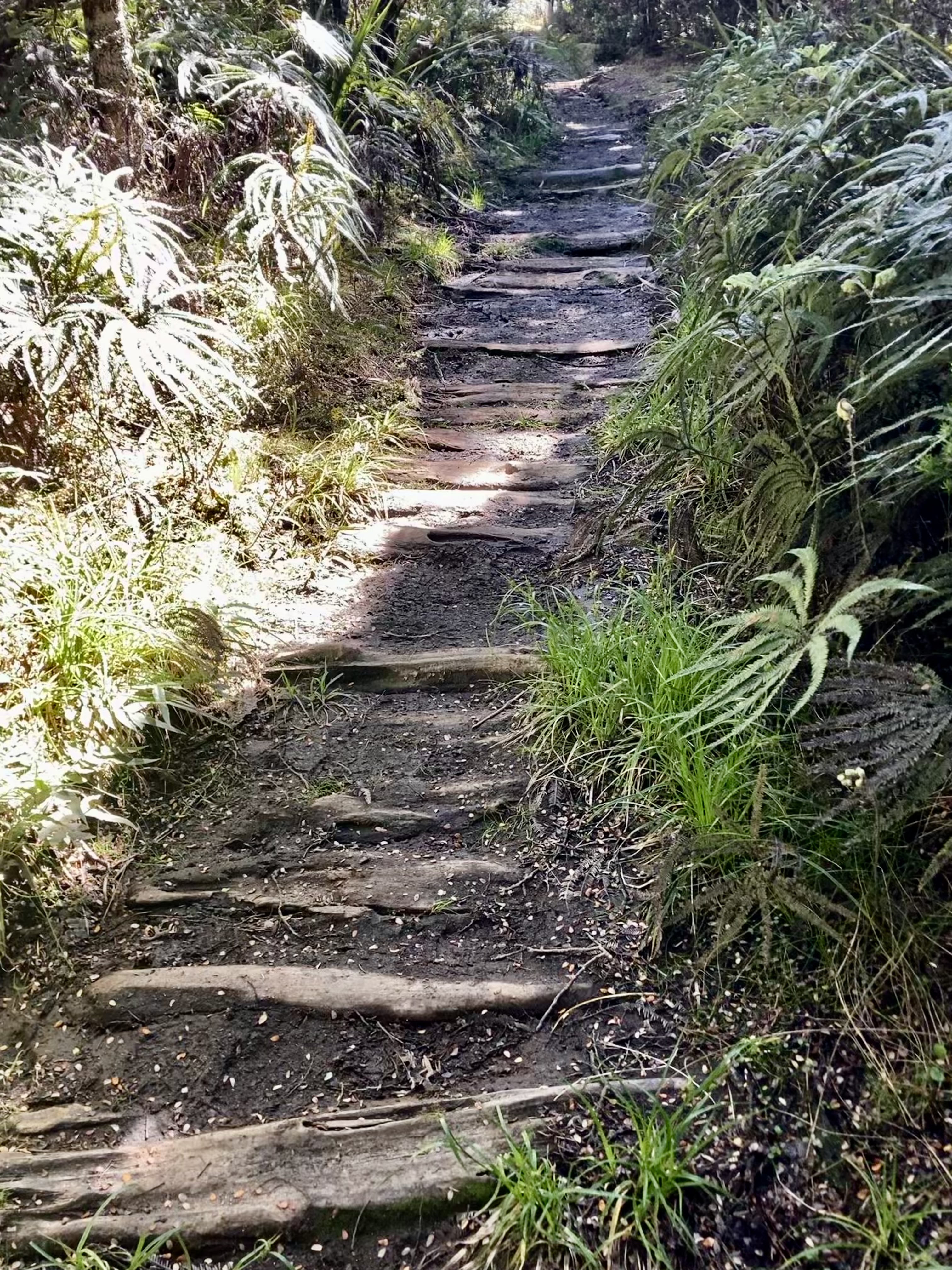 Given how difficult some of the tracks on this mountain are you’d be forgiven for thinking this is a fairly easy walk. Some parts of it are, but others are challenging. Most of the time you are in the forest, where sunlight filters through the low trees, where stray ferns and twigs drift across the path into your face. There are a few small open areas, the largest a boardwalk-over-wetland near the end, a section where the wind can almost blow you over, or steal your foot. The gradient is mainly gentle, but it is a continuous uphill with some steeper sections when you hit the denser forest in the middle part, a couple of fallen trees to navigate when we did it recently. It begins as an easy stroll, then turns into an adventure hike when you come across eroded areas that have left steps so steep it’s physically impossible to get up them (I’m talking waist high here). Add in the deep pools that sit beneath some of these steps after rain, and the ankle-deep mud that surrounds them, and it’s a recipe for strained muscles if not more serious injury. Early in the track’s life hikers laid logs across the soggiest parts, which was kind of them, but rounded logs aren’t the easiest things to walk on – your feet slip on the wet wood and your toes get trapped in the small gaps between them. If the weather is on your side it’s a pleasant couple of hours; in the wet it’s hell and I recommend avoiding. This is not a hike you do after heavy rain. Even in summer there are large patches of mud to negotiate and at all times you will have to paddle some of it.