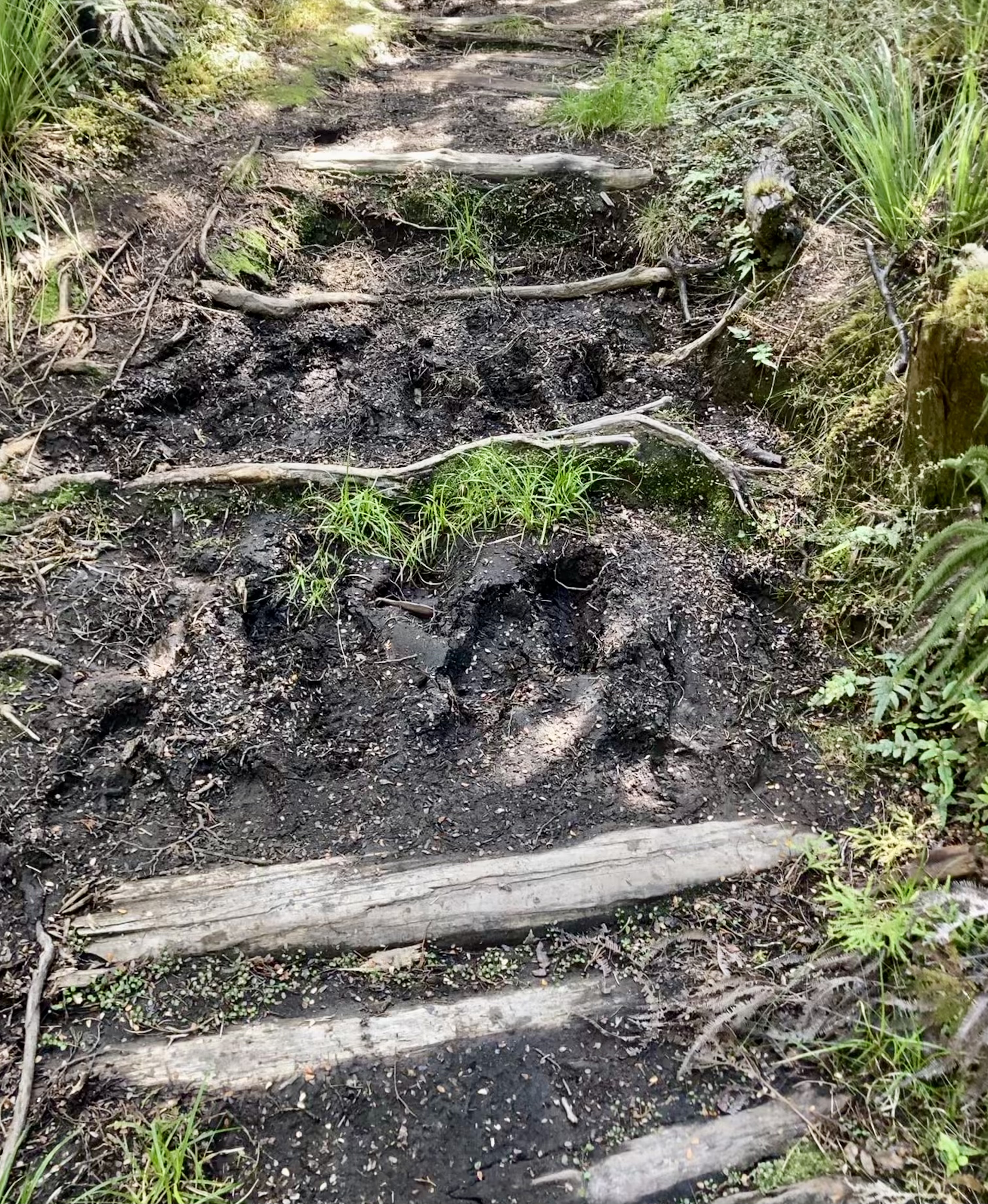 Considering the length of time since our initial visit we presumed, on our return, that some repairs must have been done. Nope. It was worse, and it is each time we walk it. The erosion by many feet and much water means the huge steps get higher each year, some now bypassed by unofficial, hiker-feet-created, new sections. The old-style boardwalks over the open area near the end are half-sinking, half-collapsing, and I swear they were designed with tripping in mind. It’s impossible to walk normally on these things, the gaps larger than the wood between them, gaps that grab even the sturdiest boot if you have the temerity to try and do more than shuffle along them.