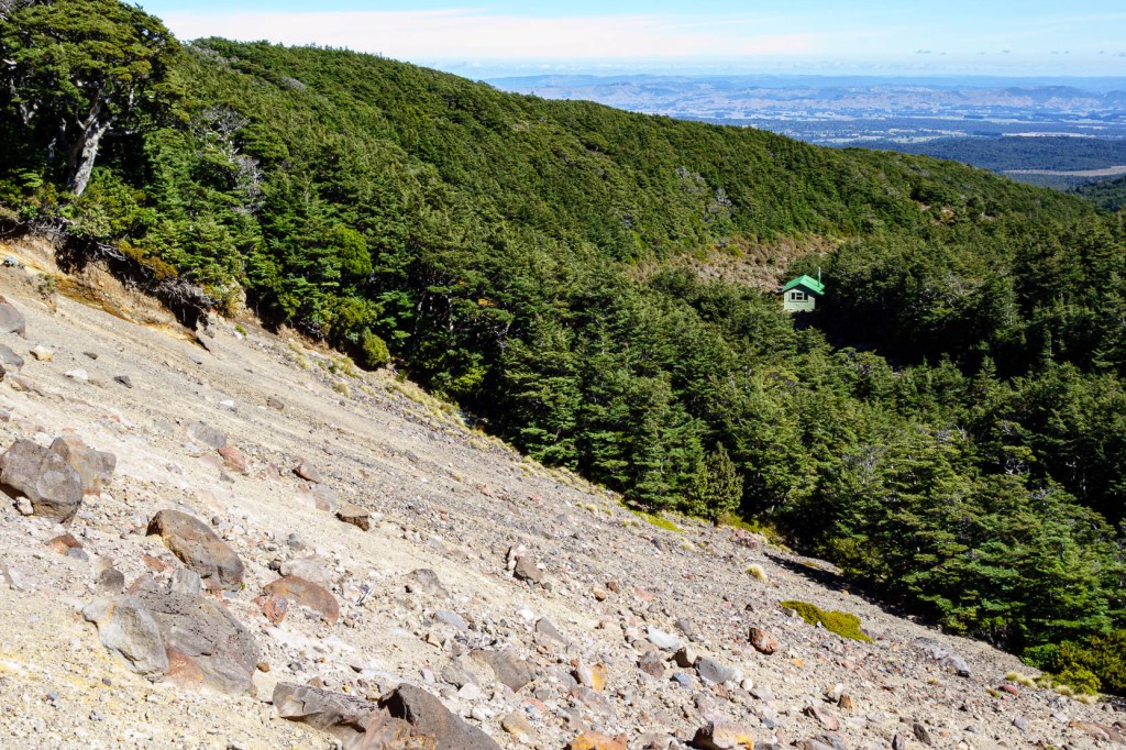 Today we’re walking back the way we came and, the sun too hot to allow us to sit on the open mountainside, we return to the hut and seek shade on its wide deck to eat lunch. Below us to the south the buildings of Ohakune are tiny. To our left – east – steam rises from the distant pulp mill. Tall trees to our right, usually buffeted by the wind they offer shelter from, today stand still and silent. All we can hear is the crunch of radishes and the occasional chirrup from a bird. A huge dragonfly detours his flight to check us out before moving on. Not a bad picnic spot, Joe.