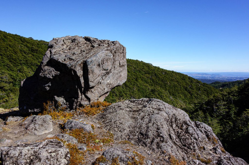 The track climbs on a mix of eroded path, which can be a bit of a scramble, and boards built over the worst parts (yay for track maintenance!) In the forest and shaded by trees I’m still hot and breathing hard by the time we reach the junction, where I come millimetres away from braining myself on the low sign. We leave the circular trail and turn left, still going up, now on a ridge with the sound of a river below on our right. A grey warbler trills away somewhere, his song clear on a rare windless day. Depending on whether I’m paying attention, tree roots are either a foothold or a trip hazard, snagging toes and poles. Tiny leaves confetti the ground, a sign we are in beech forest, and the pale narrow trunks of silver beech rise beside us.