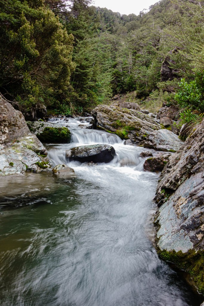 Crossing the next stream isn’t the challenging part; getting out the other side is. It looks like a wall of steep bank and impenetrable bush, except one tree is a blue pole with an orange triangle at its top – a track marker. If your legs are twice as long as mine you’ll have no problems, otherwise you’ll do as I do and haul yourself up with the help of tree roots and branches and a prayer to the tramping gods that the crumbling soil will hold your weight for the few seconds it has to until you’re at the top of the bank.