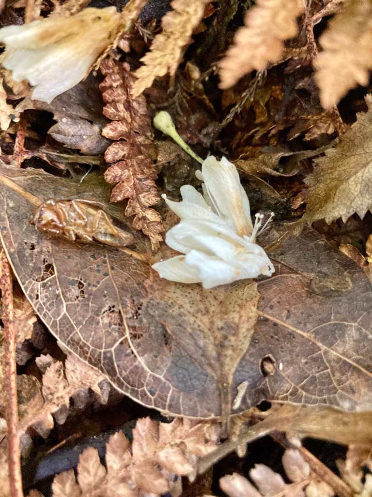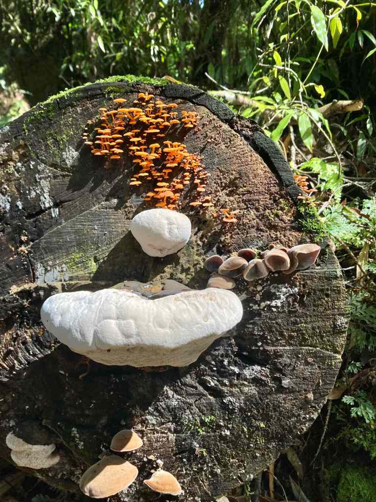 We meander through sparse bush, dropping down to pop out to an open area. A path detours to a grey sandy beach and the river, shallow on this side, deep in the shade of steep cliffs the other. At the end of a walk on a warm day it’s probably inviting but I’m not yet hot enough to brave what looks like ice-cold, although glass-clear water. We return to the track and zigzag up through mature trees shading the sun. Tiny, tulip-shaped, white flowers litter the ground like snow. I pause and look up, but it’s impossible to identify from which tree they come. A party of funghi and mushrooms cluster on the end of a felled tree. We clamber up the rough track, across muddy patches and around tree roots, boards covering the worst parts. A runner pounds towards us and I admire her lack of concern for her ankles on the uneven ground.