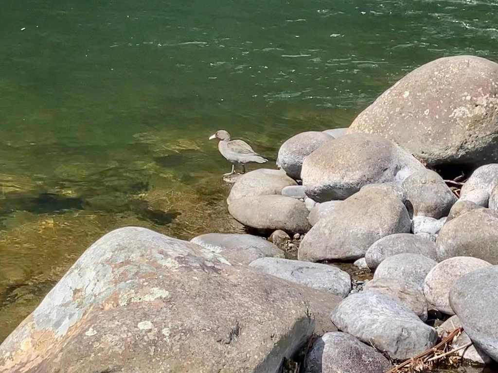 Across the access road the track drops down via steep steps to a secluded and peaceful lagoon, the water moved only by a silent duck gliding into the tall reeds as we approach the boardwalk crossing. Another line of boards, elevated, skirts a huge tree, a hundred-plus-year-old totara, its crown hidden from view by the surrounding trees, before the path returns to the river. At the water’s edge the heat thrown back at us from the grey rock makes this swimming hole, also tucked under a cliff, seem more inviting. A flash of white upstream catches my attention – a duck sits on a small boulder by the water, its pale beak catching the sun as it preens its grey feathers. A whio! Labelled as endangered, the whio (blue duck) is endemic to New Zealand and known as an indicator of river health – they need a clean, fast-flowing stream to exist. They also struggle against introduced predators and loss of habitat, whether caused by human or mother nature (flooded rivers wash away their nests). A sighting of a whio, other than on a ten-dollar note, is rare. Neil positions himself for a photo, cursing that he has only a phone and not his camera. Seems whio are as attuned as any bird to recognise a lens being directed at them and it plops off the rock into the water, paddling effortlessly upstream and away from us.
