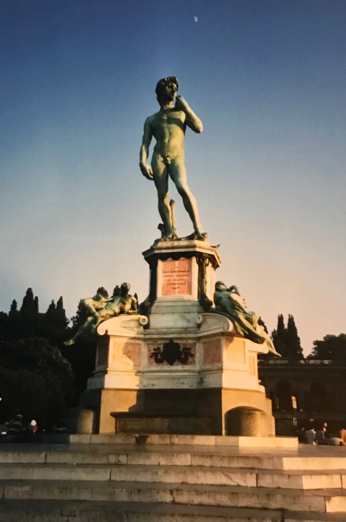Note: Our trip pre-dated digital photography and the picture above is a digital photograph of a printed photograph developed from film. Despite searching, we can’t find any photos that we may have taken of the real David, leading us to the conclusion that photography was/is banned in the Galleria, which kind of makes sense. We also couldn’t find the photo of the view including Florence that I was sure I’d taken. Clearly my memory for some things isn’t that great.