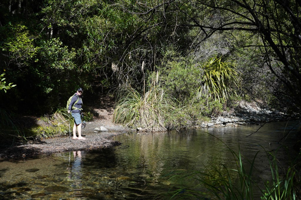 The path levels as we hear the bubble of water. This stream is neither wide nor deep and flows nowhere near as fast as those on the mountain do, therefore is easy to cross, although deep enough that it would breach the top of our boots. On the return journey it won’t be an issue but I’m not keen on squelching along with wet feet for a few hours so we whip off our boots and slip on jandals, wading into water that is cold but not mountain-stream frigid. Then it’s time to exercise the lungs as the path climbs on its steepest gradient, loose stones rattling underfoot. I wonder how it can be possible to get purchase on wheels.