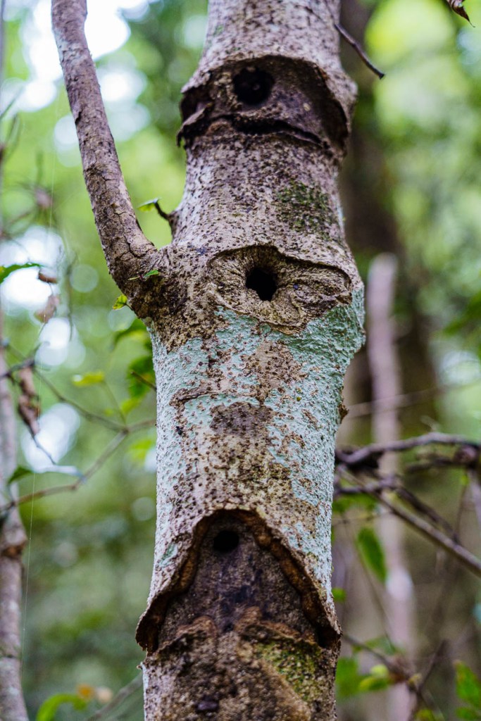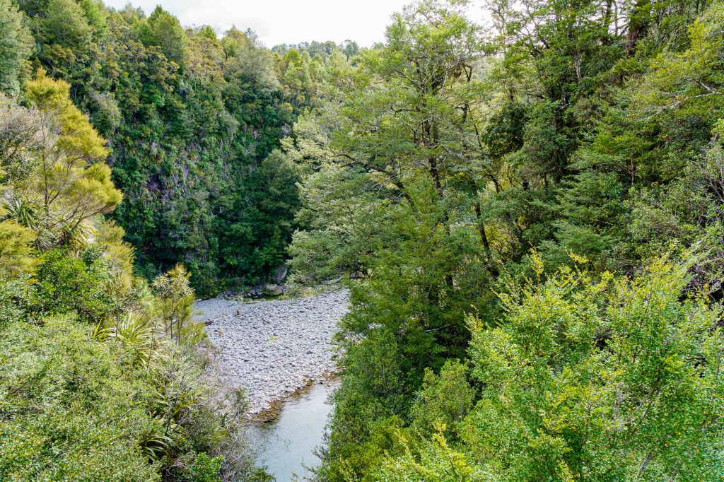We push our way through or detour around at least half a dozen blockages before reaching the swingbridge and bouncing onto it for a view of the gorge and the river. The track continues for a few km to the highway but we turn here, re-tracing our steps, re-crossing the river, allowing the cold water to flow into our boots this time. On the final incline I pause by a small tree with holes punched through its bark and into its flesh, the work of the puriri grub, which lives in tree holes until it pupates into New Zealand’s largest moth. I investigate for a minute while I get my breath back, then puff on up to the car, removing wet boots and socks to drive home.